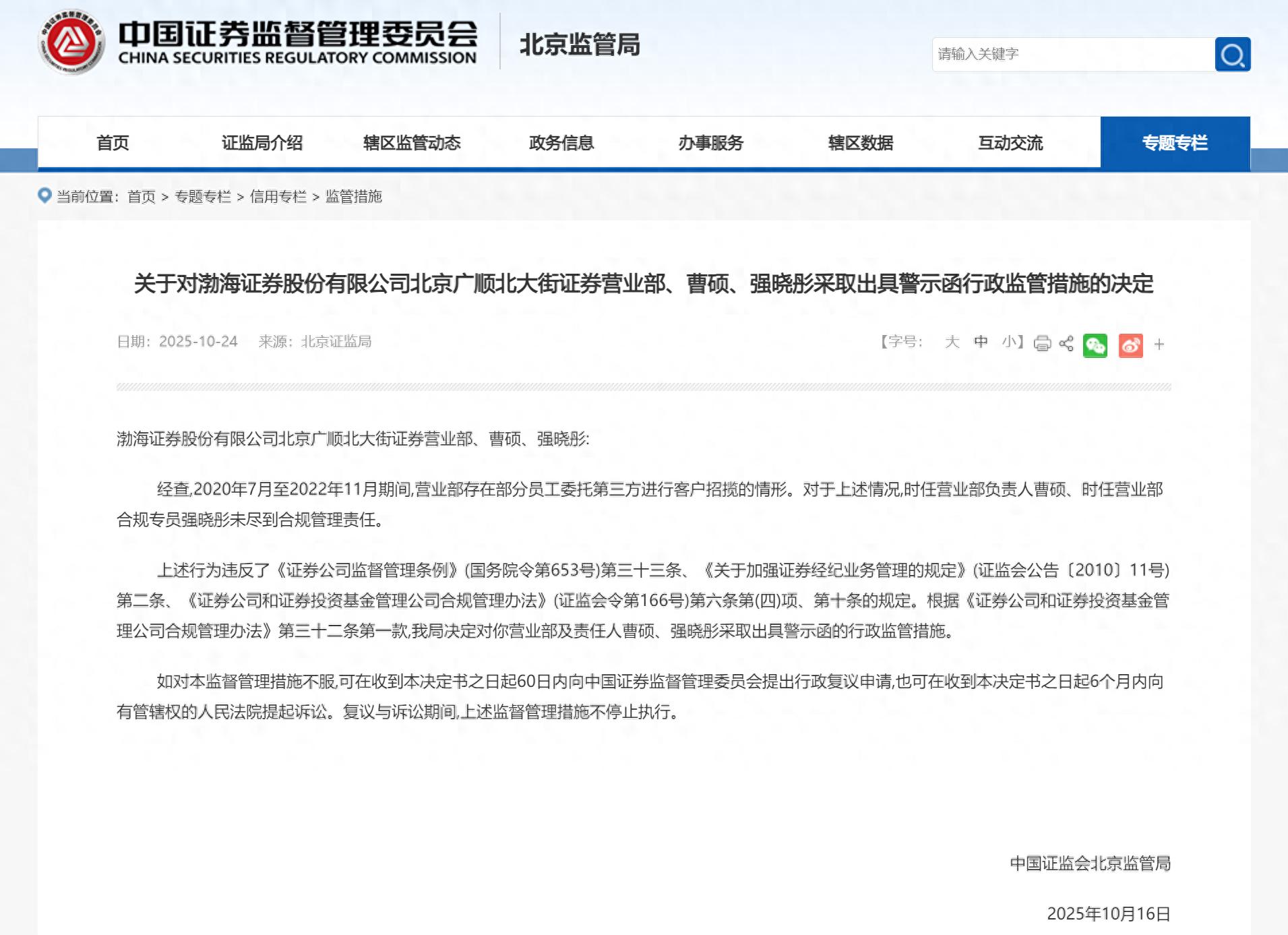 上述行为违反了《证券公司监督管理条例》(国务院令第653号)第三十三条、《关于加强证券经纪业务管理的规定》(证监会公告〔2010〕11号)第二条、《证券公司和证券投资基金管理公司合规管理办法》(证监会令第166号)第六条第(四)项、第十条的规定。根据《证券公司和证券投资基金管理公司合规管理办法》第三十二条第一款,北京证监局决定对渤海证券北京广顺北大街证券营业部及责任人曹硕、强晓彤采取出具警示函的行政监管措施。