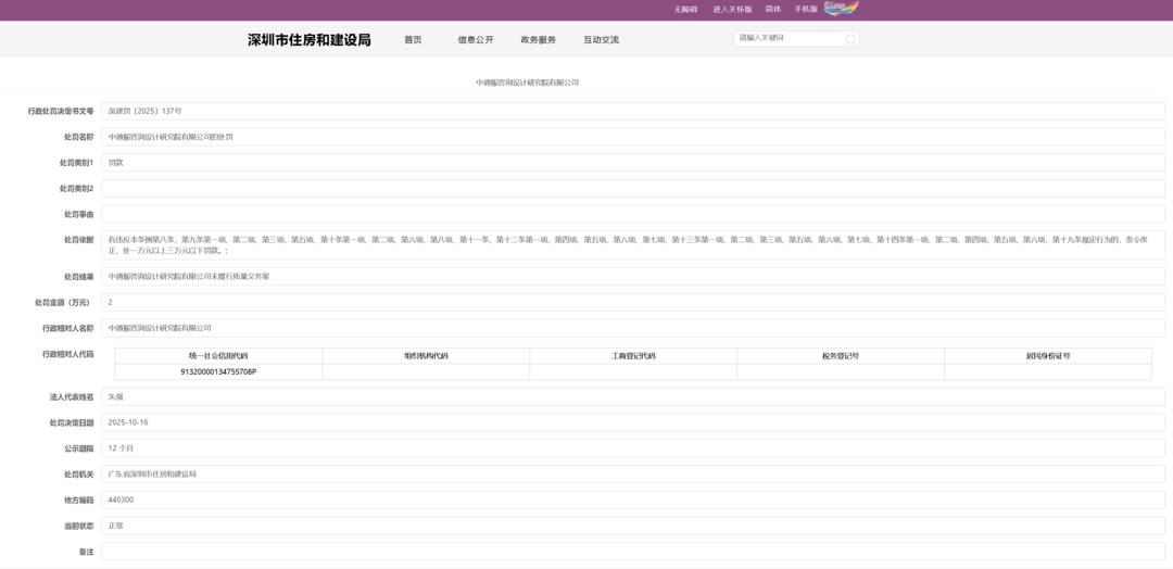 记者从深圳市住房和建设局官网获悉,中通服咨询设计研究院有限公司因未履行质量义务案,被广东省深圳市住房和建设局罚款2万元。