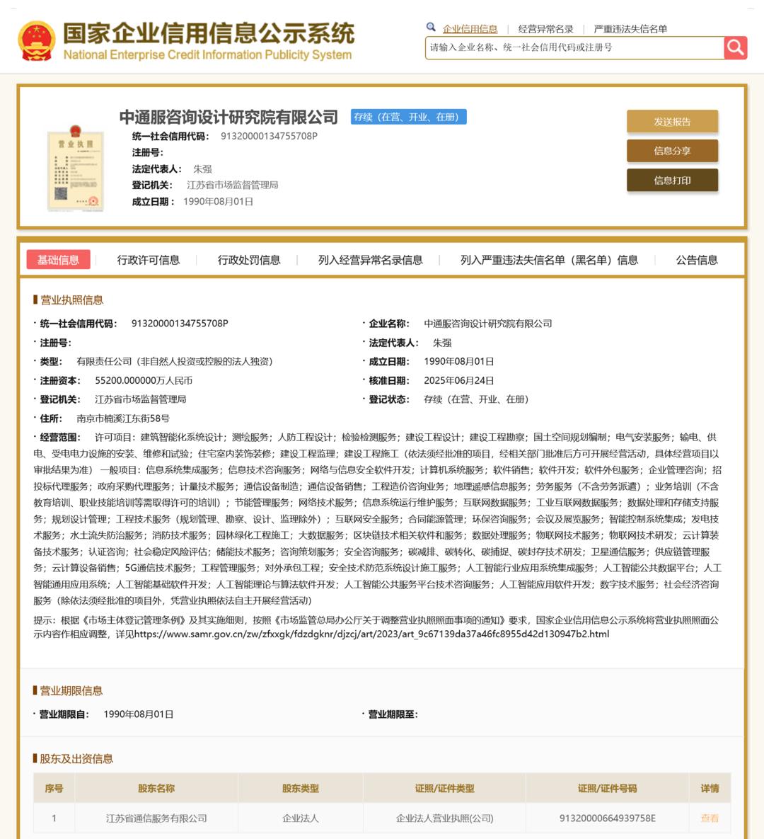 公开信息显示,中通服咨询设计研究院有限公司成立于1990年8月1日,法定代表人朱强,股东为江苏省通信服务有限公司。