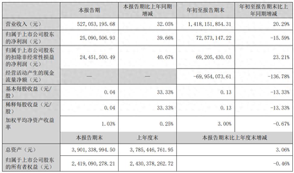 其中第三季度,公司营业收入为5.27亿元,同比上升32.05%;归母净利润为2509万元,同比上升39.66%;扣非归母净利润为2445万元,同比上升40.67%。