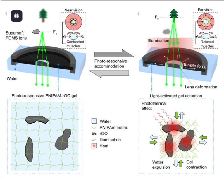 这种名为光响应水凝胶软透镜(PHySL)的装置,由嵌入吸光氧化石墨烯的水凝胶构成,中心设有微型透镜。当光线照射时,氧化石墨烯吸收光能产生热量,导致水凝胶收缩,从而拉伸中央透镜,使其曲率改变,实现瞳孔扩大和焦距延长;当光照减弱时,凝胶冷却并恢复原状,透镜也随之回缩至初始形态,整个过程无需外部电源或机械驱动装置。