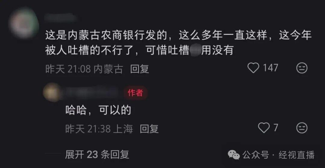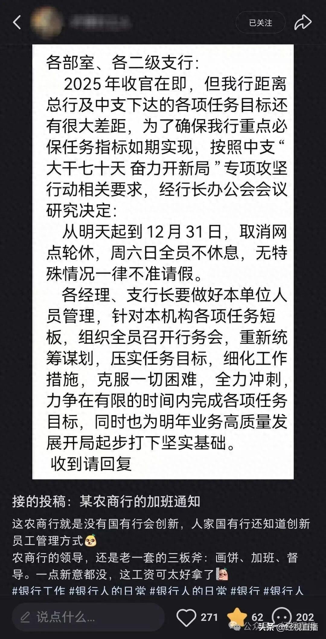 网传通知截图显示,该通知提及“按照中支‘大干七十天 奋力开新局’专项攻坚行动相关要求,经行长办公会会议研究决定”,作出上述安排。有网友在评论区留言称,“这是内蒙古农商银行发的,这么多年一直这样”,并强调消息真实度极高。10月27日,经视直播记者尝试联系发帖人及跟评网友核实情况,但截至发稿未获回应。