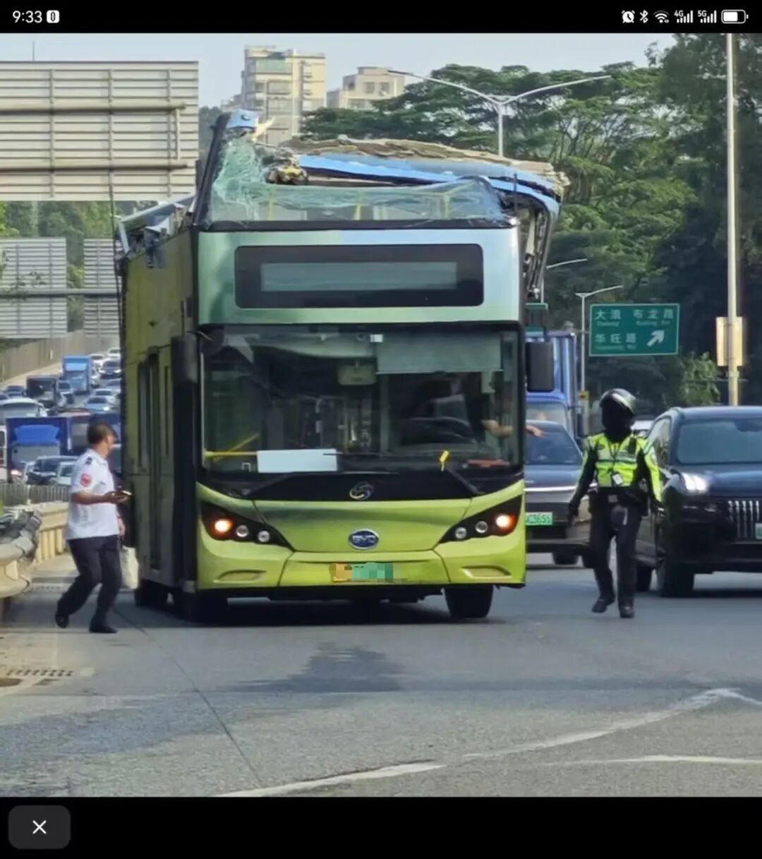 10月26日,广东深圳一辆双层巴士顶部在高架桥下被挤压变形,引发关切。