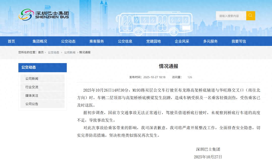 10月27日,深圳巴士集团发布情况通报,称2025年10月26日14时30分,M193路双层公交车行驶至布龙路高架桥底辅道与华旺路交叉口(南往北方向)时,车辆二层顶部与高架桥桥底横梁发生刮蹭,造成车辆受损及一名乘客轻微刮伤,受伤乘客已及时送医。