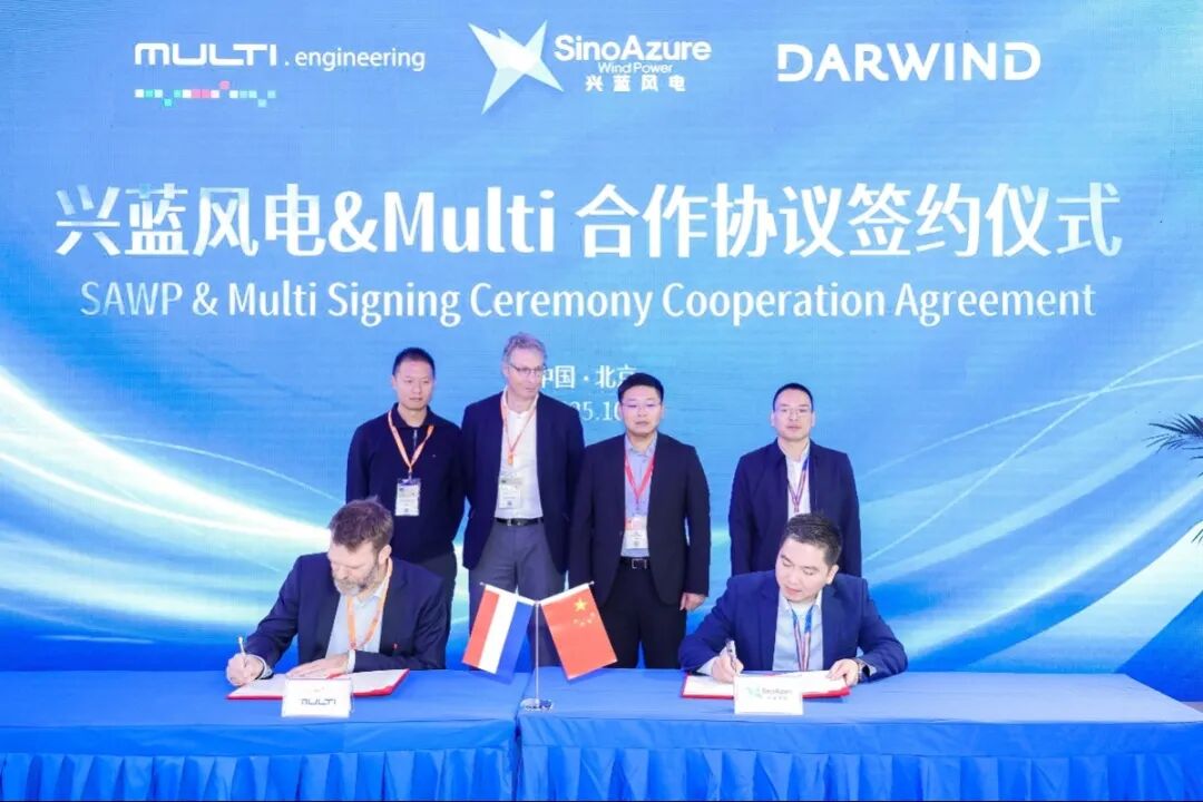 在2025年北京国际风能展览会上,兴蓝风电与荷兰Multi Engineering Group B.V.正式签署战略合作协议,双方将携手推进“双机头一浮体”漂浮式风电解决方案的开发与商业化。兴蓝风电党委书记、董事长曹颖春出席签约仪式。