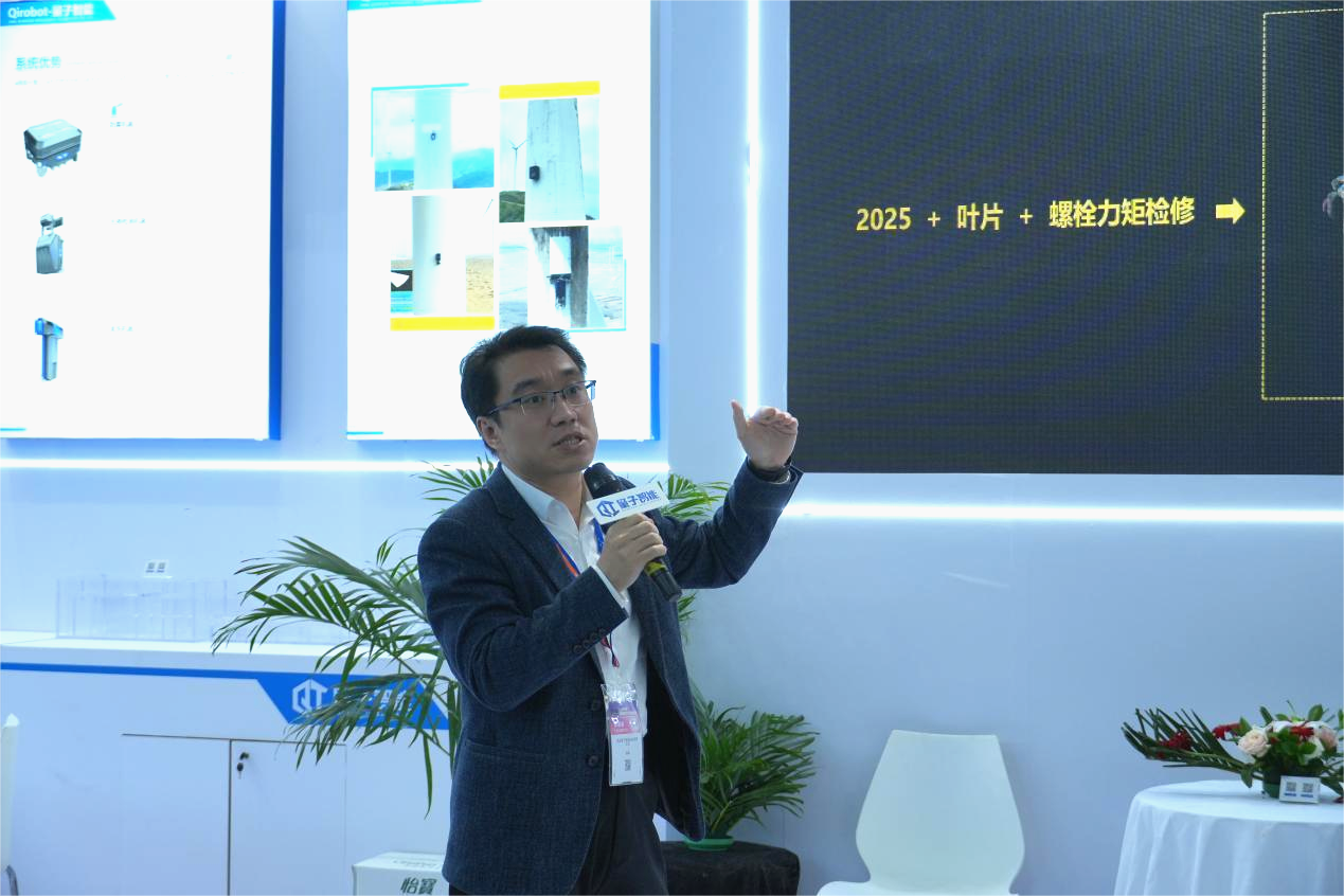 2025年10月20日,以“推动全球能源转型,携手实现可持续发展”为主题的北京国际风能大会暨展览会(CWP 2025)在中国国际展览中心(顺义馆)盛大启幕。量子智能携三款自主研发叶片探伤检测机器人、螺栓力矩检测机器人、四轮足巡检机器人首次集体亮相。这一产品矩阵的发布,标志着量子智能实现了从风机高空作业到地面站区巡检的“陆空一体”全场景运维能力覆盖,为风电场安全、智能、高效运维服务提供了完整解决方案。