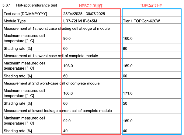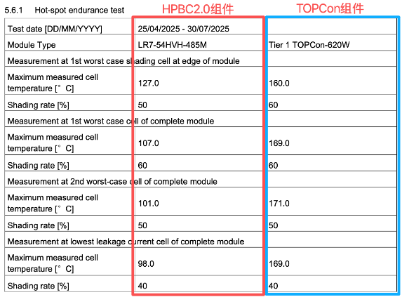 在相同遮挡条件下,TOPCon组件局部温度超过160摄氏度,而HPBC2.0组件的局部温度升高至100余摄氏度,相比TOPCon组件最高降低热斑温度77℃,显示出卓越的热斑风险控制能力。