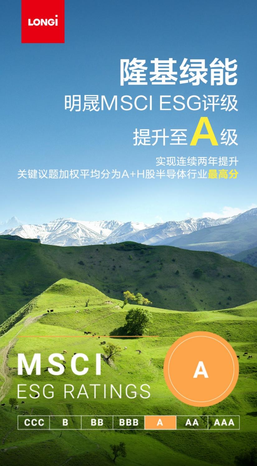 10月25日,国际权威指数机构MSCI(明晟)发布隆基绿能(601012.SH)环境、社会及治理(ESG)最新结果,隆基ESG评级提升至“A”级,关键议题加权平均分(WAKIS)目前为A+H股半导体行业最高分,实现连续两年评级提升。