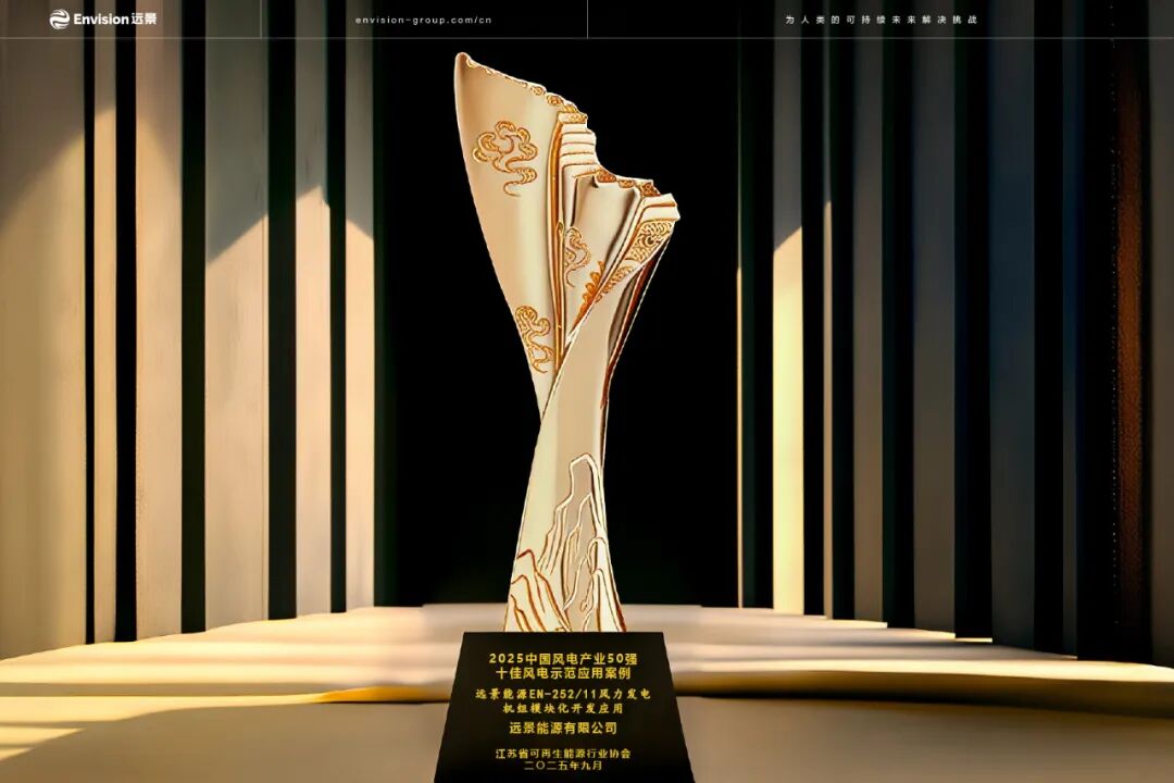 十余年来,远景能源在江苏持续深耕,打造集高端制造、大规模储能、全产业链协同和零碳技术示范于一体的“零碳母港”和“高端产业集群”,深度发挥风电产业龙头效应,打造了远景首个海上大兆瓦智能风机制造基地、自建海上风电试验场、江苏单体规模最大新型储能电站、集成传动链研发制造测试基地、叶片制造基地等,吸引了包括海缆、塔筒、叶片在内的多家产业链核心企业入驻,形成了覆盖研发制造、开发建设、运维服务的规模化产业体系。为了表彰远景在江苏海上风电研发、建设、运营等方面的卓越成就,组委会为远景能源颁发十佳优质风电产品——远景能源自研自制传动链(齿轮箱+主轴承),十佳风电示范应用案例——远景能源EN-252/11风力发电机组模块化开发应用等重要奖项。