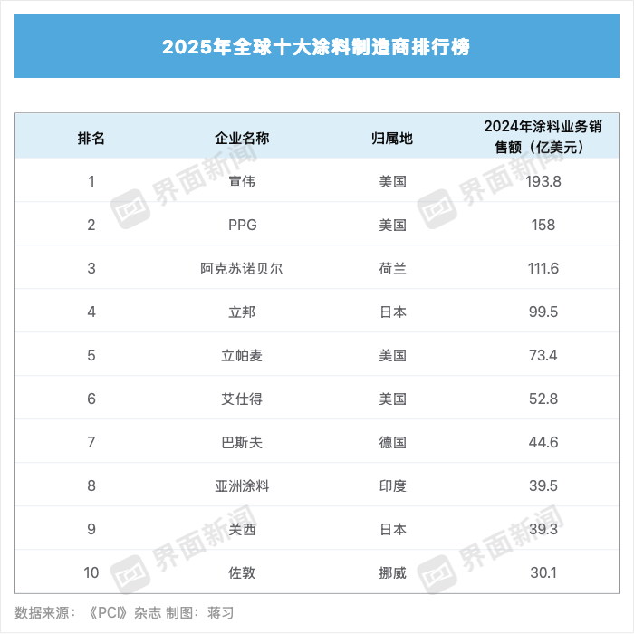 根据美国《PCI》杂志发布的2025年全球十大涂料企业榜单,巴斯夫以销售额44.6亿美元位列第七。该排名基于2024年涂料销售收入,其他非涂料产品的销售收入不包括在内。排名前三的企业是宣伟、PPG、阿克苏诺贝尔,分别实现销售额约193.8亿美元、158亿美元、111.6亿美元。