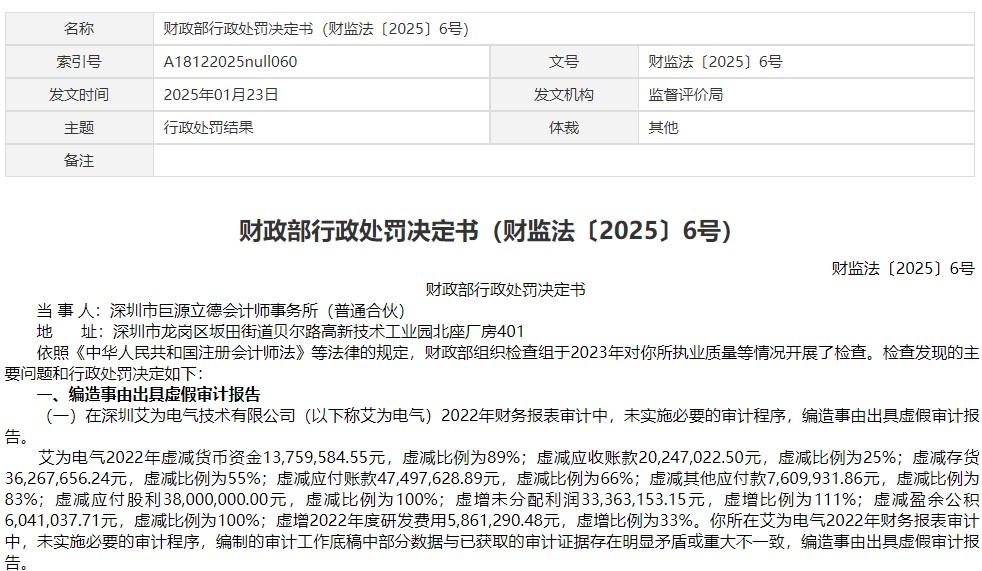 2025年1月23日,财政部对巨源立德所出具行政处罚决定书。根据处罚决定,该所存在“编造事由出具虚假审计报告”的情形,并披露了6家公司的案例,其中就包括艾为电气。
