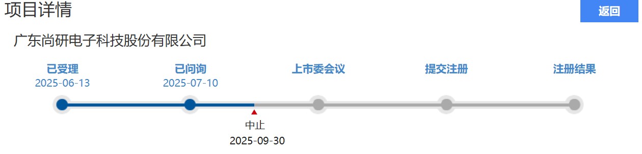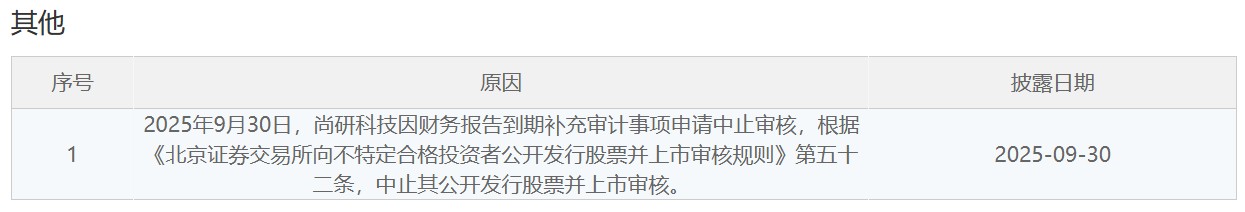 此外,9月29日,尚研科技因财务报告到期补充审计事项申请中止审核,北交所根据相关规定中止其公开发行股票并上市审核,尚研科技最新IPO进程显示为“中止”。