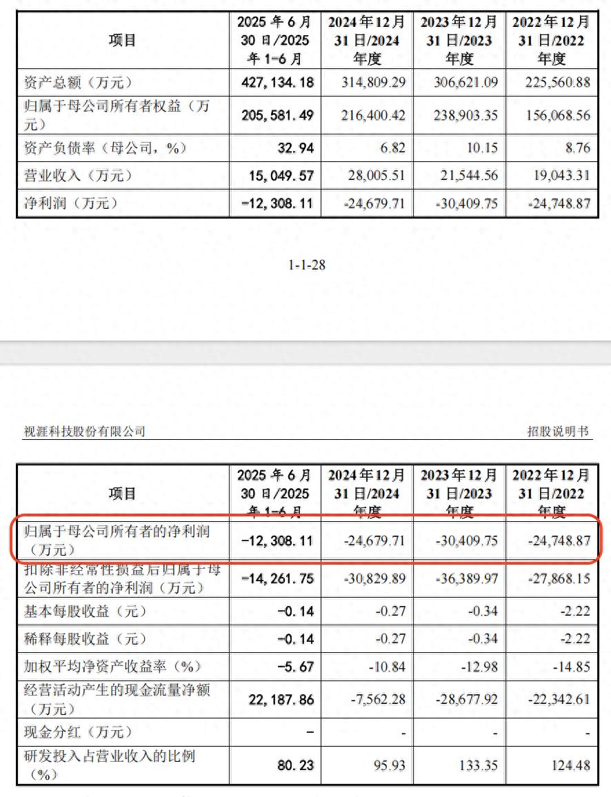 报告期(2022年~2025年上半年)各期,视涯科技分别实现营收约1.9亿元、2.15亿元、2.8亿元、1.5亿元,归母净利润-2.47亿元、-3.04亿元、-2.47亿元、-1.23亿元,3年半累计亏损约9.21亿元。