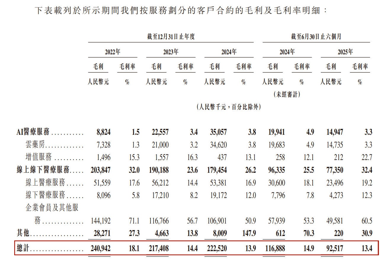 毛利率方面,该公司各业务板块表现不一。健康管理会员服务2022-2024年及2024-2025年上半年利润率分别为-24.1%、12.8%、1.9%、3.8%及0.7%,2024年利润率大幅下降主要因业务从单一疾病管理扩展至多疾病管理。线上线下医疗服务中,线上医疗服务毛利率在2023年因医生薪酬问题降至14.4%,2024年调整后回升至16.9%;线下医疗服务毛利率则从2022年的5.8%逐步提升至2024年的12.0%。整体来看,毛利率波动较大且呈下降趋势,反映出公司在成本控制和定价策略上面临挑战。具体数据为: