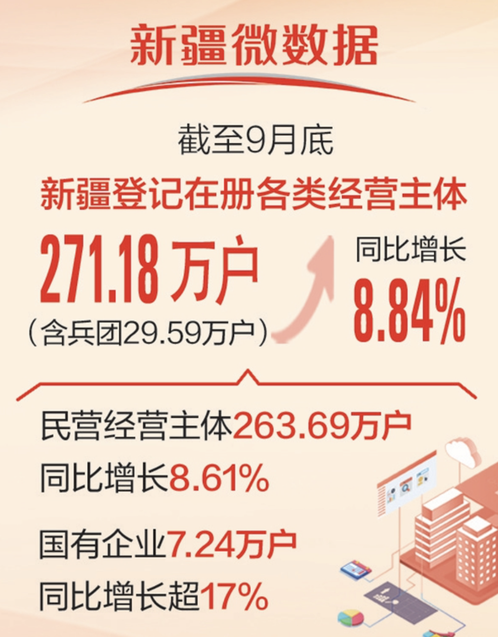 本报乌鲁木齐10月16日讯 石榴云/新疆日报记者索蓉芝从自治区市场监督管理局获悉:截至今年9月底,新疆登记在册各类经营主体达271.18万户(含新疆生产建设兵团29.59万户),注册资本(金)7.9万亿元,同比分别增长8.84%、8.48%,呈现量质齐升良好发展态势。