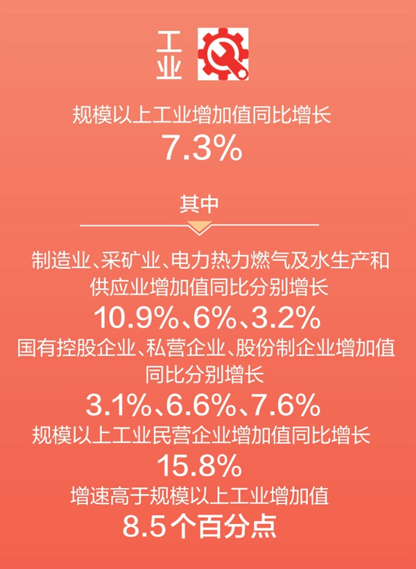 分三大门类看,制造业、采矿业、电力热力燃气及水生产和供应业增加值同比分别增长10.9%、6%、3.2%。分经济类型看,国有控股企业、私营企业、股份制企业增加值同比分别增长3.1%、6.6%、7.6%。