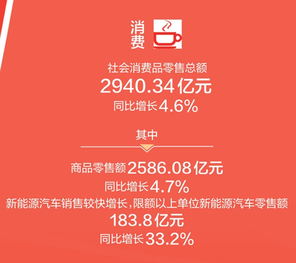 前三季度,生活类商品稳步增长,限额以上单位饮料类、粮油食品类、日用品类、烟酒类零售额同比分别增长16%、14.2%、11.7%、7.7%;部分改善型消费持续升温,限额以上单位书报杂志类、文化办公用品类零售额同比分别增长15.5%、48.2%;新能源汽车销售较快增长,限额以上单位新能源汽车零售额183.8亿元,同比增长33.2%。