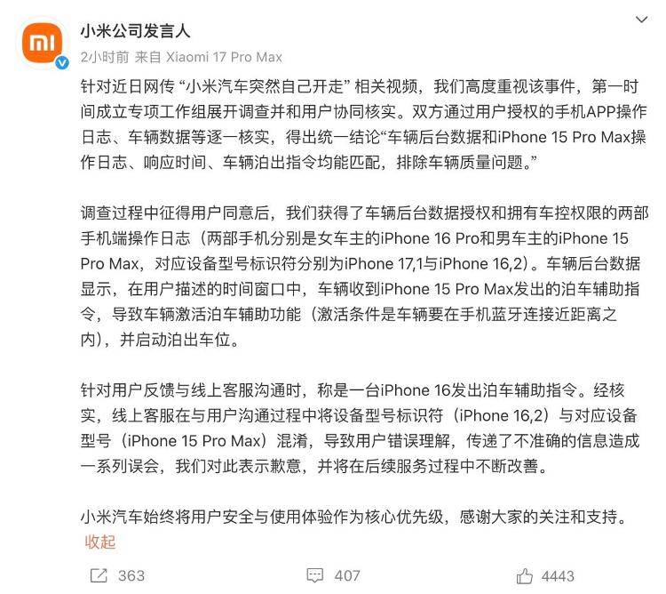 针对近日网传 “小米汽车突然自己开走” 相关视频,我们高度重视该事件,第一时间成立专项工作组展开调查并和用户协同核实。双方通过用户授权的手机APP操作日志、车辆数据等逐一核实,得出统一结论“车辆后台数据和iPhone 15 Pro Max操作日志、响应时间、车辆泊出指令均能匹配,排除车辆质量问题。”