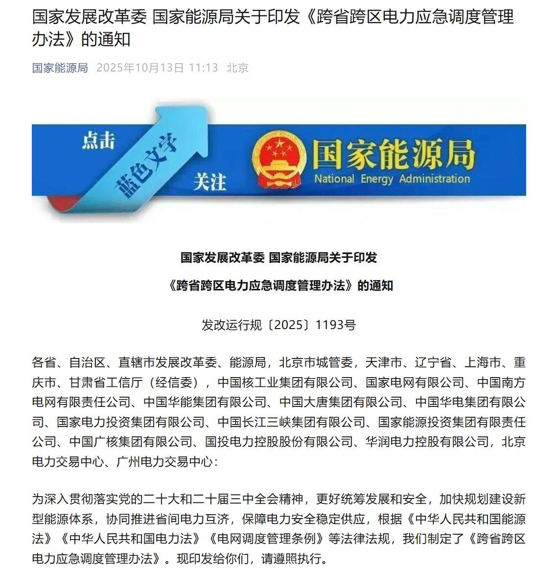 近期,据国家发展改革委和国家能源局消息,两部门印发《跨省跨区电力应急调度管理办法》。