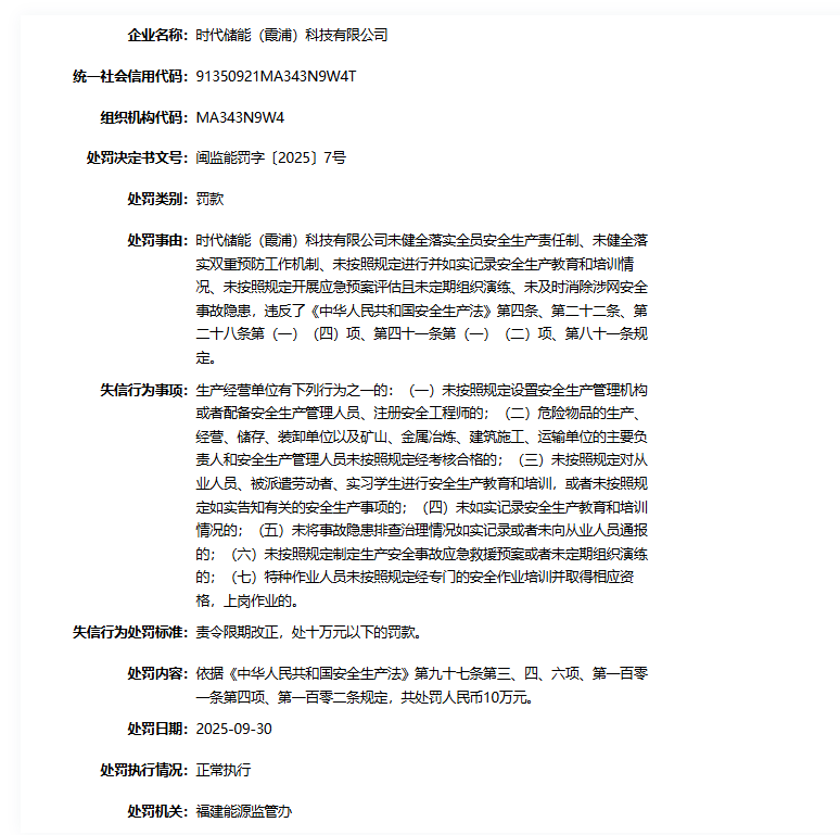 近日,国家能源局福建能源监管办发布行政处罚决定书,以违反电力安全生产法律法规对时代储能(霞浦)科技有限公司进行行政处罚,罚款10万元。
