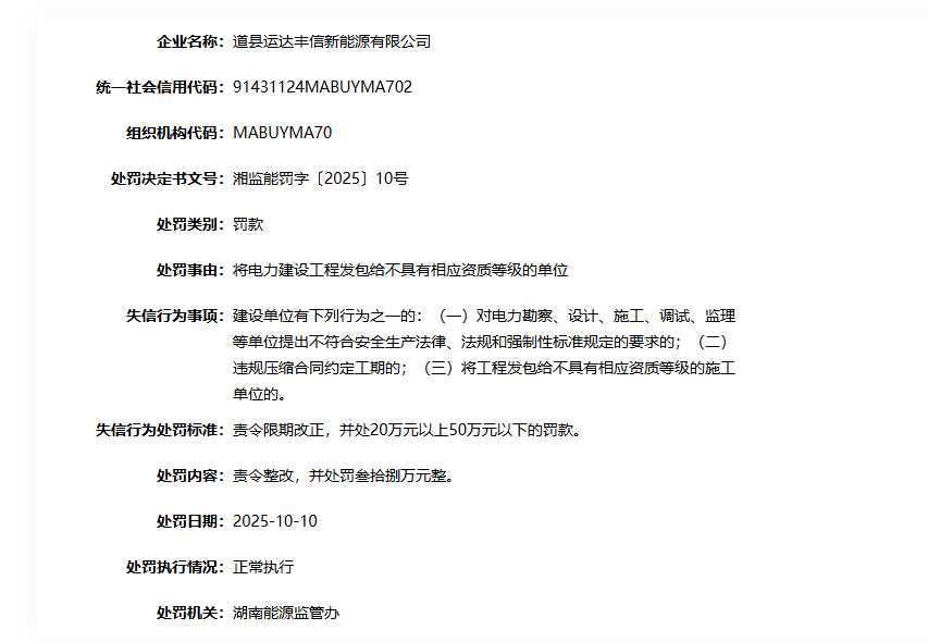 道县运达丰信新能源有限公司因将电力建设工程发包给不具有相应资质等级的单位被湖南能源监管办处罚,责令限期改正,并处20万元以上50万元以下的罚款。