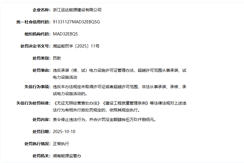 浙江运达能源建设有限公司因违反承装(修、试)电力设施许可证管理办法,超越许可范围从事承装、试电力设施活动,被湖南能源监管办处罚,责令停止违法行为,并合计罚没金额45.98万。