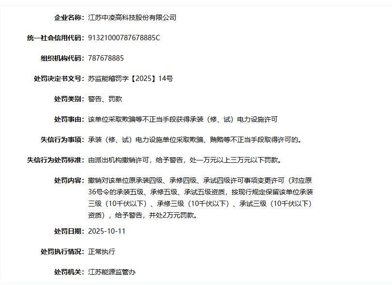 近日,国家能源局处罚信息显示,江苏中凌高科技股份有限公司因采取欺骗等不正当手段获得承装(修、试)电力设施许可被江苏能源监管办罚款2万元。