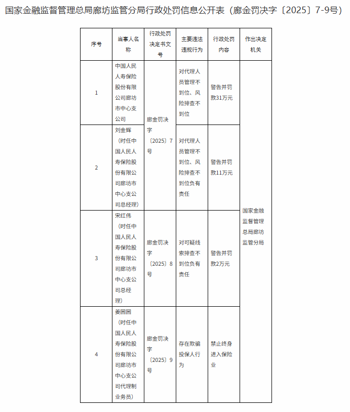 10月17日,国家金融监督管理总局廊坊监管分局行政处罚信息显示,中国人民人寿保险股份有限公司廊坊市中心支公司因对代理人员管理不到位、风险排查不到位被警告并罚款31万元 。同时,刘金辉(时任中国人民人寿保险股份有限公司廊坊市中心支公司总经理)因对代理人员管理不到位、风险排查不到位负有责任,被警告并罚款11万元;宋红伟(时任中国人民人寿保险股份有限公司廊坊市中心支公司总经理)因对可疑线索排查不到位负有责任,被警告并罚款2万元;姜圆圆(时任中国人民人寿保险股份有限公司廊坊市中心支公司代理制业务员)因存在欺骗投保人行为,被禁止终身进入保险业。