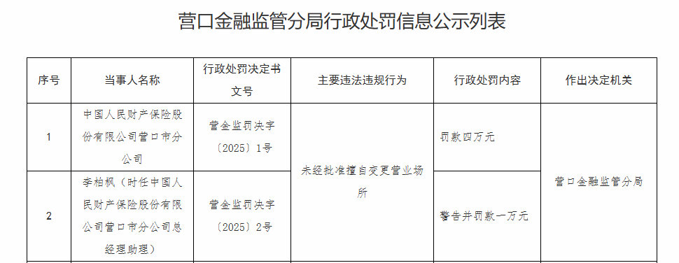 10月17日,国家金融监督管理总局营口金融监管分局行政处罚信息显示,中国人民财产保险股份有限公司营口市分公司因未经批准擅自变更营业场所被罚款四万元;李柏枫(时任中国人民财产保险股份有限公司营口市分公司总经理助理)因未经批准擅自变更营业场所被警告并罚款一万元。