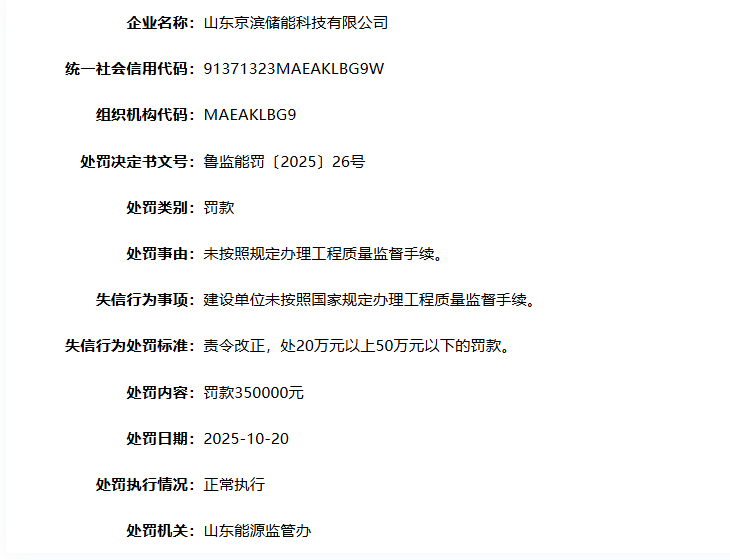 近日,国家能源局资质和信用信息系统披露处罚信息显示,山东京滨储能科技有限公司因未按照规定办理工程质量监督手续,被山东能源监管办罚款35万元。