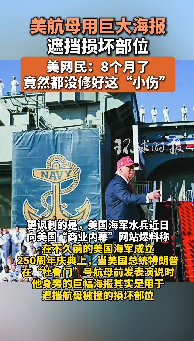 然而,在10月5日诺福克海军基地举办美国海军成立250周年庆典期间,一名在场美军水手向 “商业内幕”网站提供的照片显示,特朗普身旁的“杜鲁门”号航母悬挂着巨幅海报,而海报恰好遮住了该舰此前碰撞受损的部位。