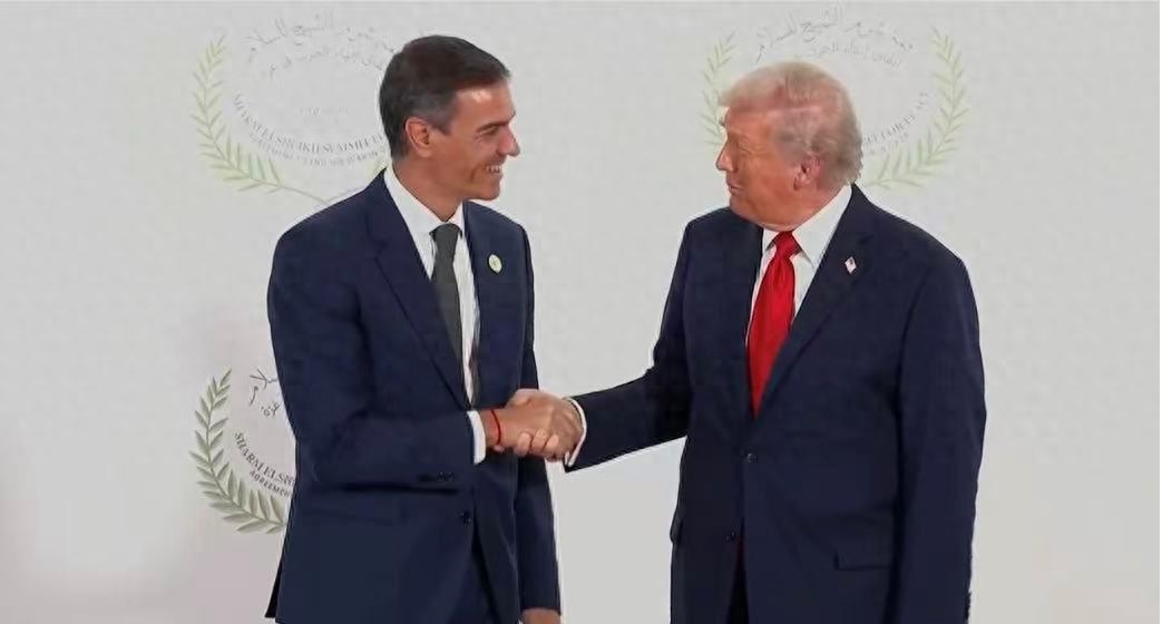 当地时间10月13日,美国总统特朗普在埃及举办的“和平峰会”上会见了出席峰会的西班牙首相桑切斯。