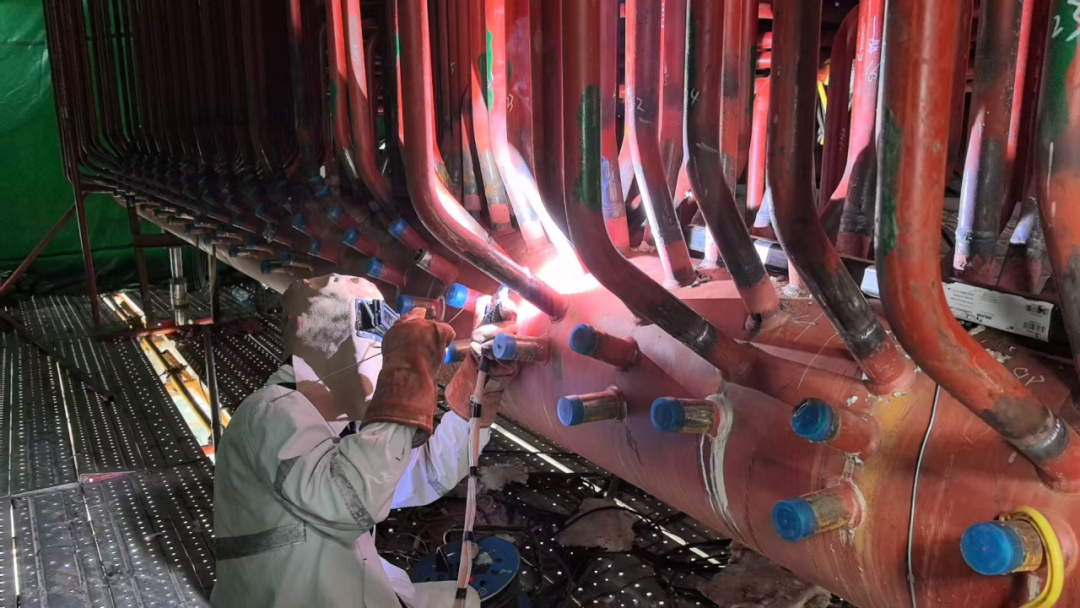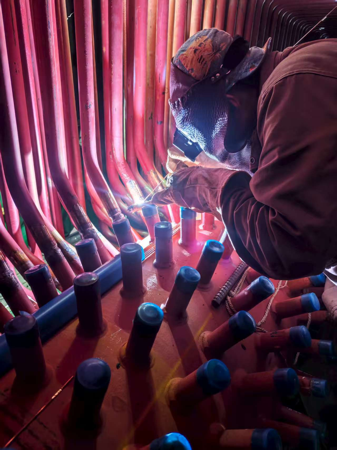与此同时,2号锅炉炉膛内部,30余名焊工身着厚重的隔热服,在狭窄的空间内躬身作业,手中的焊枪是他们的“武器”。焊枪启动的瞬间,耀眼的焊花在黑暗中绽放,高温裹挟着金属熔渣的气息弥漫开来,他们的衣服眨眼间被汗水浸透,却丝毫未影响手中焊枪的稳定运行。如果说钢架是支撑锅炉机体的“骨架”,受热面管道则是保障能量传输的“血脉”,他们此刻焊接的每一道焊缝,都是守护电厂安全高效运行的“生命线”。