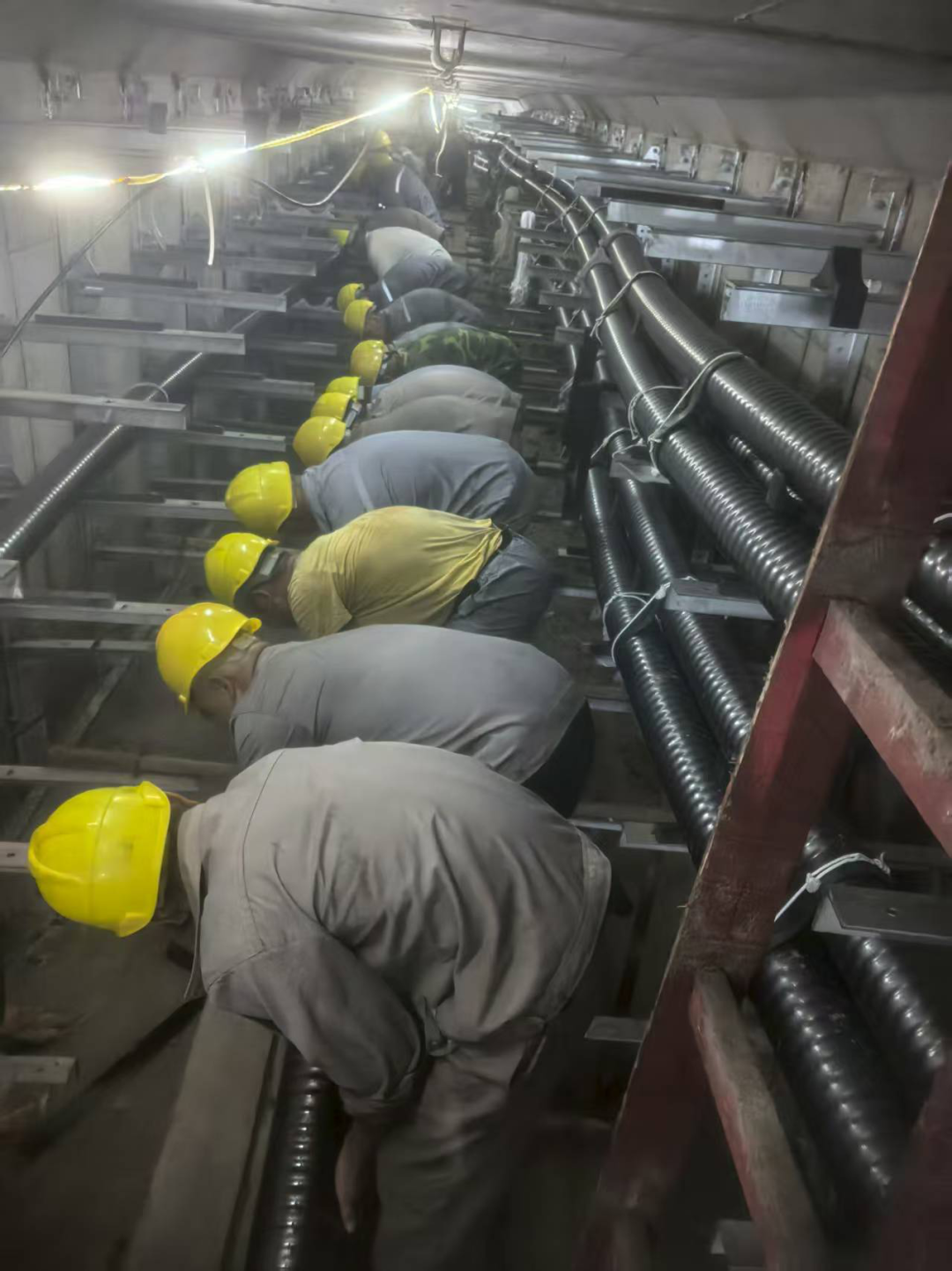 “十一”前夕,电缆敷设至这个关键弯头时,电缆摩擦力陡然增大,瞬间逼近预设轨道边缘。项目管理人员立即叫停作业,迅速采取调整方法。通过对现场的细致观察,发现是滑轮组角度存在细微偏差,导致电缆受力不均。这时,技术人员立即重新校准滑轮位置,采用“微动穿针”法,让输送机以厘米级的幅度点动,同时在弯头处电缆底部涂抹润滑剂以减小摩擦;多名工人用撬杠在轨道外壁辅助引导,为电缆“修正”角度。经过两个多小时的精细操作,电缆终于丝滑地步入正轨,进入正确位置,整个过程严格按照施工方案平稳在控,未出现任何安全质量隐患。