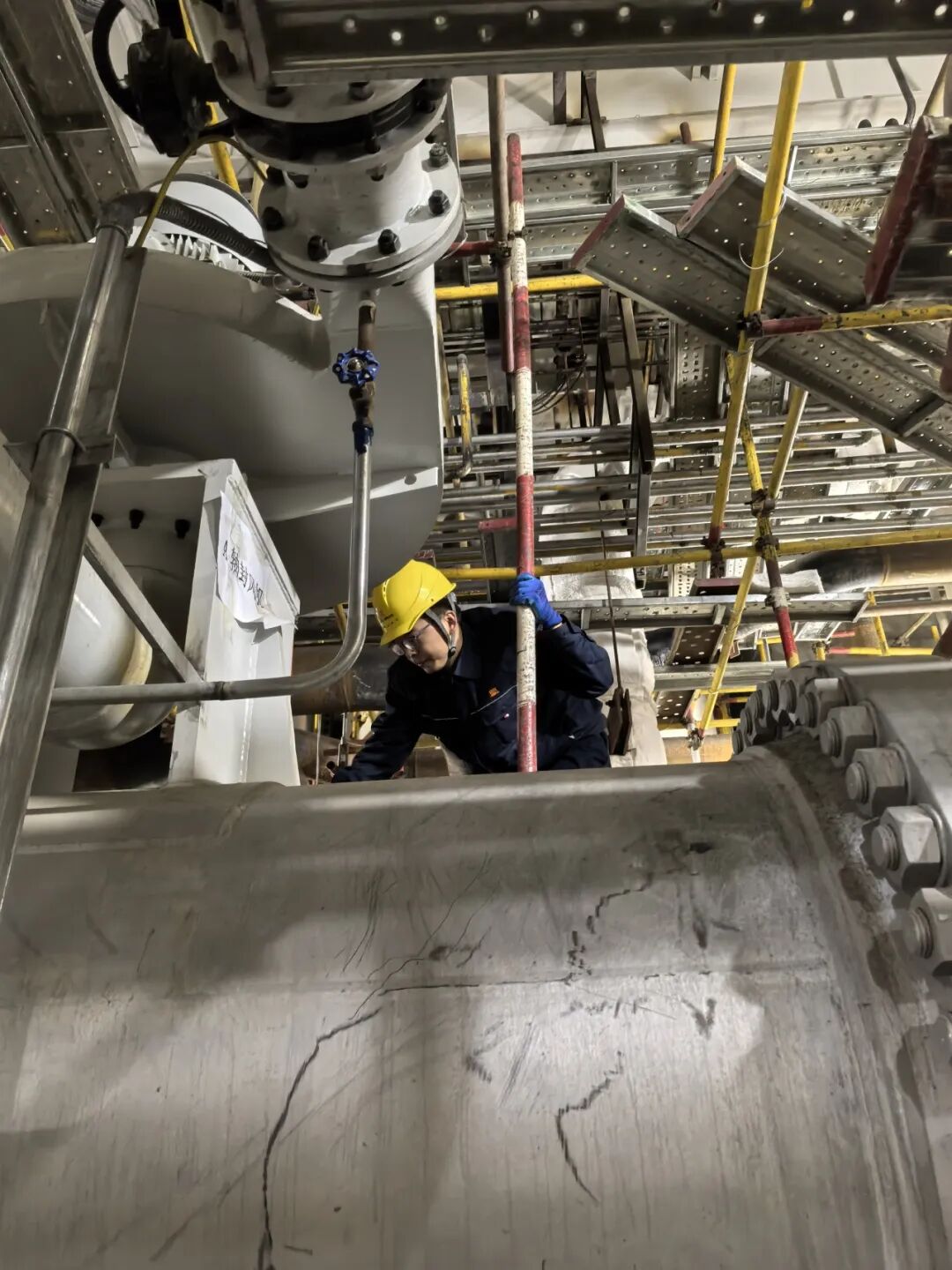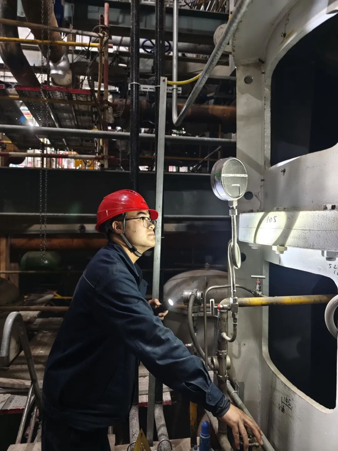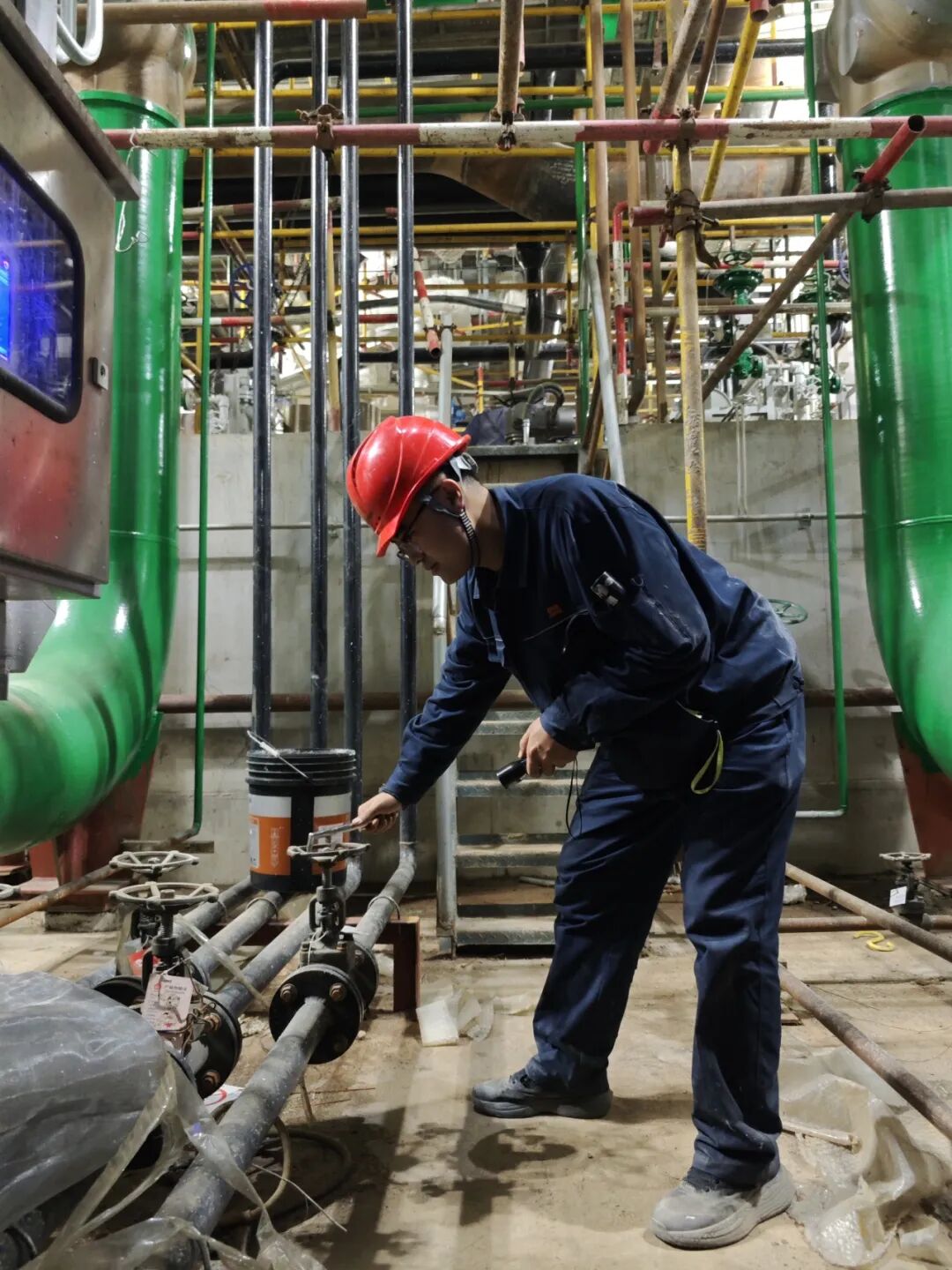 “再检查一遍轴封压力!真空还卡在35千帕降不下来,今晚必须拿下这个硬骨头!”当班运行部四值值长赫羽朋握着对讲机焦急地喊道。在设备运转现场,汽机主管赵伟蹲在凝汽器管道旁,手里捏着泡沫剂瓶,指节因用力而发白,他比谁都清楚,机组负压系统突然“卡壳”,若不及时解决,将直接影响点火进程。很快,运行部、工程部、调试院所、施工方组成20余人的检漏小组,拿着检漏仪、泡沫剂、测风条,从凝汽器抽真空系统到轴封系统,从疏水系统到压力表管,逐段排查。夜里的风带着凉意,他们却额头冒汗,“管道接口窄,得贴着才能看清”,运行部二值甄宽容趴在地上,把泡沫剂仔细涂抹在法兰连接处,直到凌晨2点,终于发现了两处细微漏点。随着一系列的操作矫正,当屏幕上的真空数值缓缓降至28千帕时,二值班组已悄然完成了交接班。