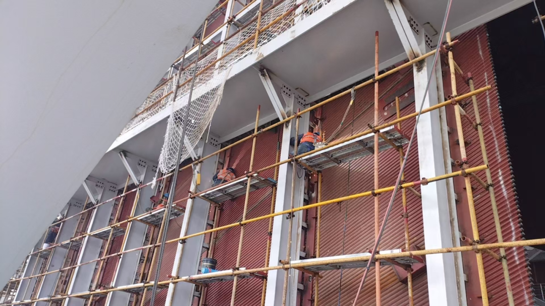 当国庆节的第一缕微光穿透晨雾,准大二期项目现场已褪去静谧。炉膛深处,受热面管道焊接作业持续推进,焊花在幽暗的空间里闪烁;锅炉外侧,封闭施工的脚手架上,建设者们正紧锣密鼓地加紧操作。节日期间,输煤栈桥的钢架搭建、关键管道的精准对接、锅炉本体的有序封闭等多线并行,2000余名建设者全员在岗,为项目投产按下“加速键”。