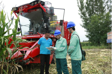 ▲国网高密市供电公司工作人员在玉米地收割现场向农户宣讲电力设施保护知识。