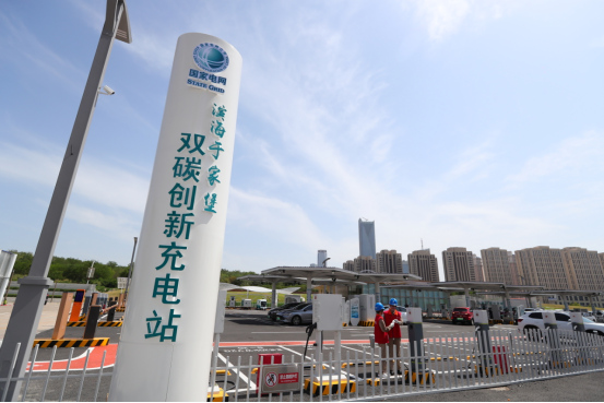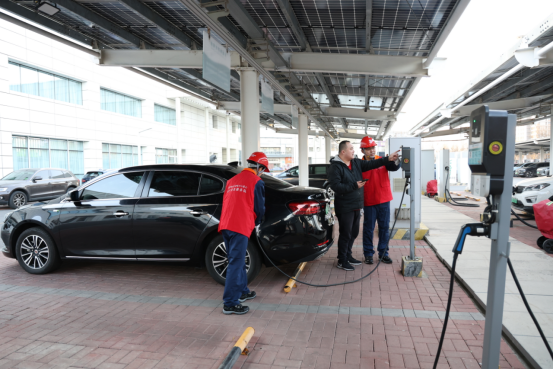 图为国网天津城南公司工作人员在津门湖新能源车综合服务中心服务新能源车主充电。