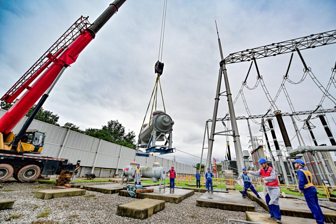 国网重庆超高压公司员工在500千伏玉屏变电站起吊500千伏新GIS断路器。刘玉峰/摄