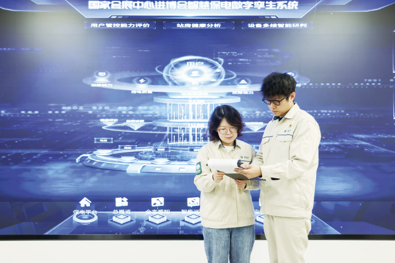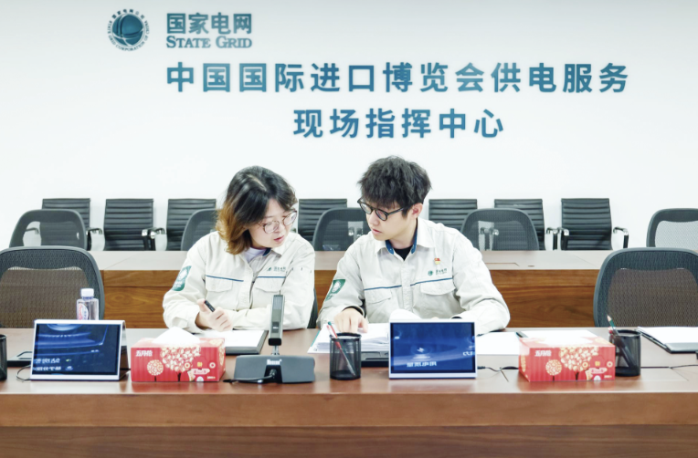 图为国网上海青浦供电公司客户经理在进博会现场指挥中心,依托“智慧保电数字孪生系统”开展安全用电检查工作。吴晓旭/摄