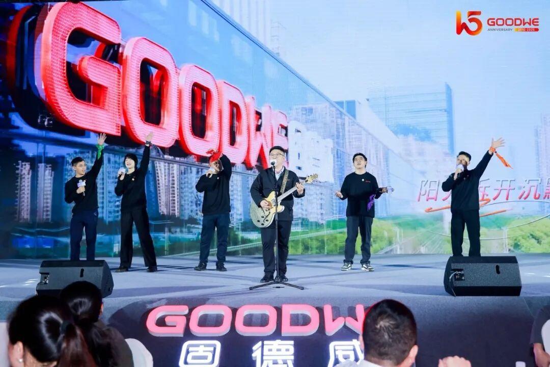 庆典晚宴上,来自固德威国内营销中心、光电建材事业部、智慧能源事业部、固德热科技、昱德新能源五大业务板块的代表携手登台,与歌曲作曲作词者潘政宇共同唱响《光启未来》。作为“源网荷储智”生态合作伙伴的一员,潘政宇现任中国农村能源行业协会分布式电源及储能专委会副秘书长、南京绿新能集团 COO、南京绿新能源研究院副院长,既是新能源行业生态的深度参与者,也是源网荷储智多元协同理念的践行者。