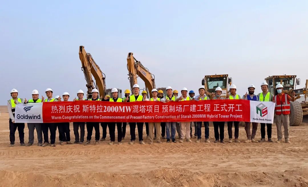 金风科技沙特混塔预制厂开工仪式 金风科技还为项目配备了自研的148米钢混塔架,可有效捕获海拔更高的优质风能资源,提升项目发电效率。为缩短运输距离,提高混塔交付效率,金风科技还将在当地建设混塔工厂,以项目高质量、按期交付为目标,兼顾本地化生产与属地产业链发展。