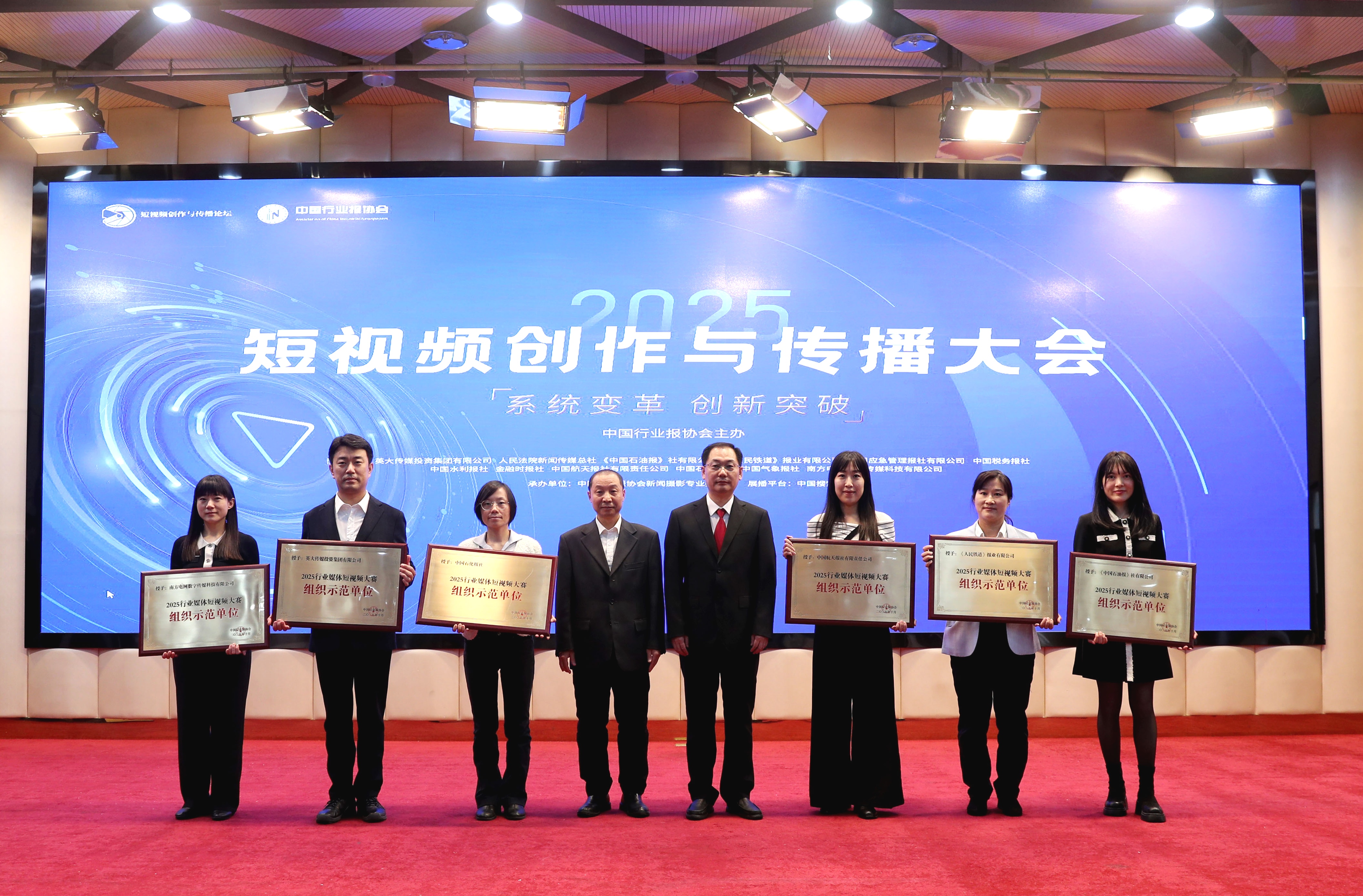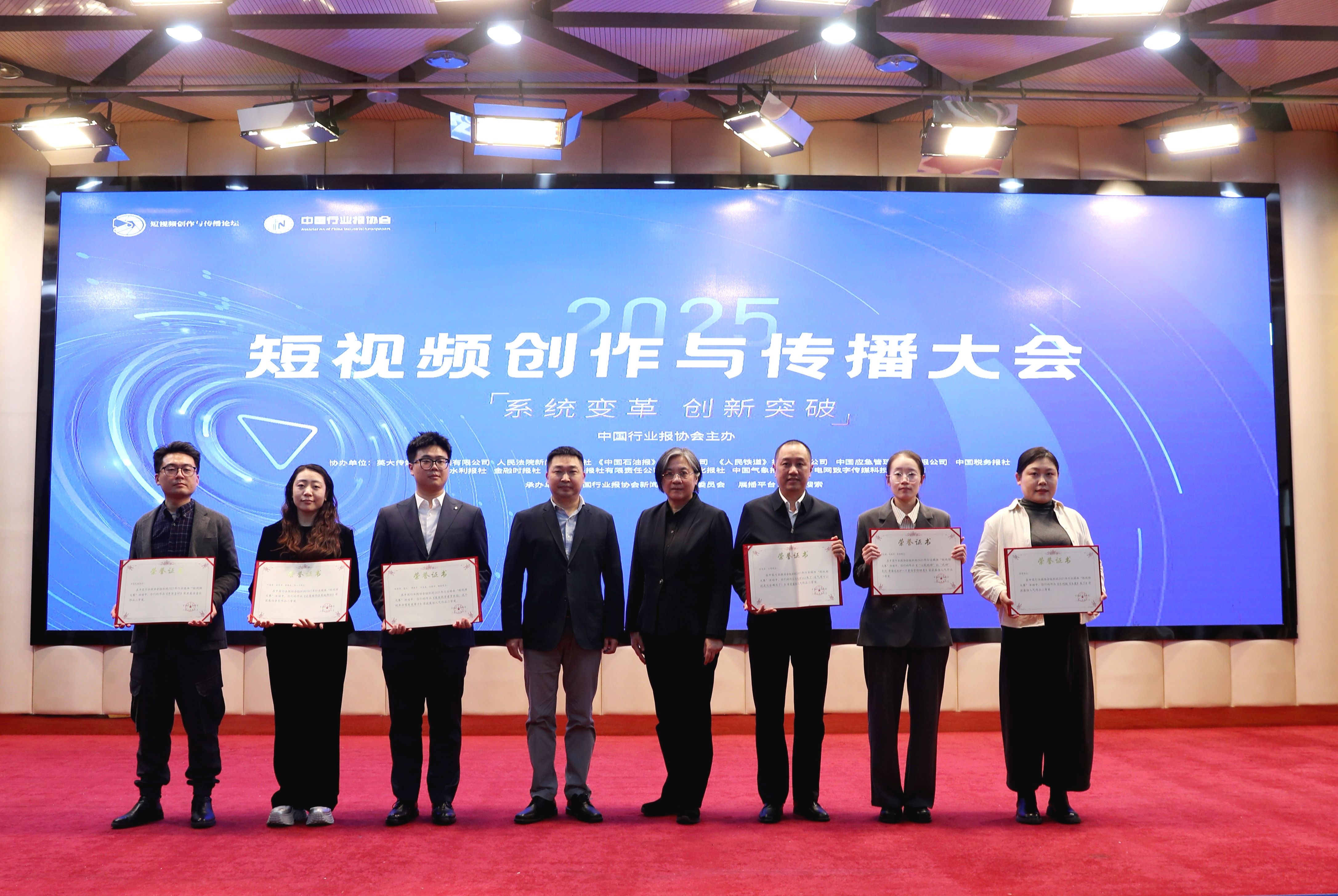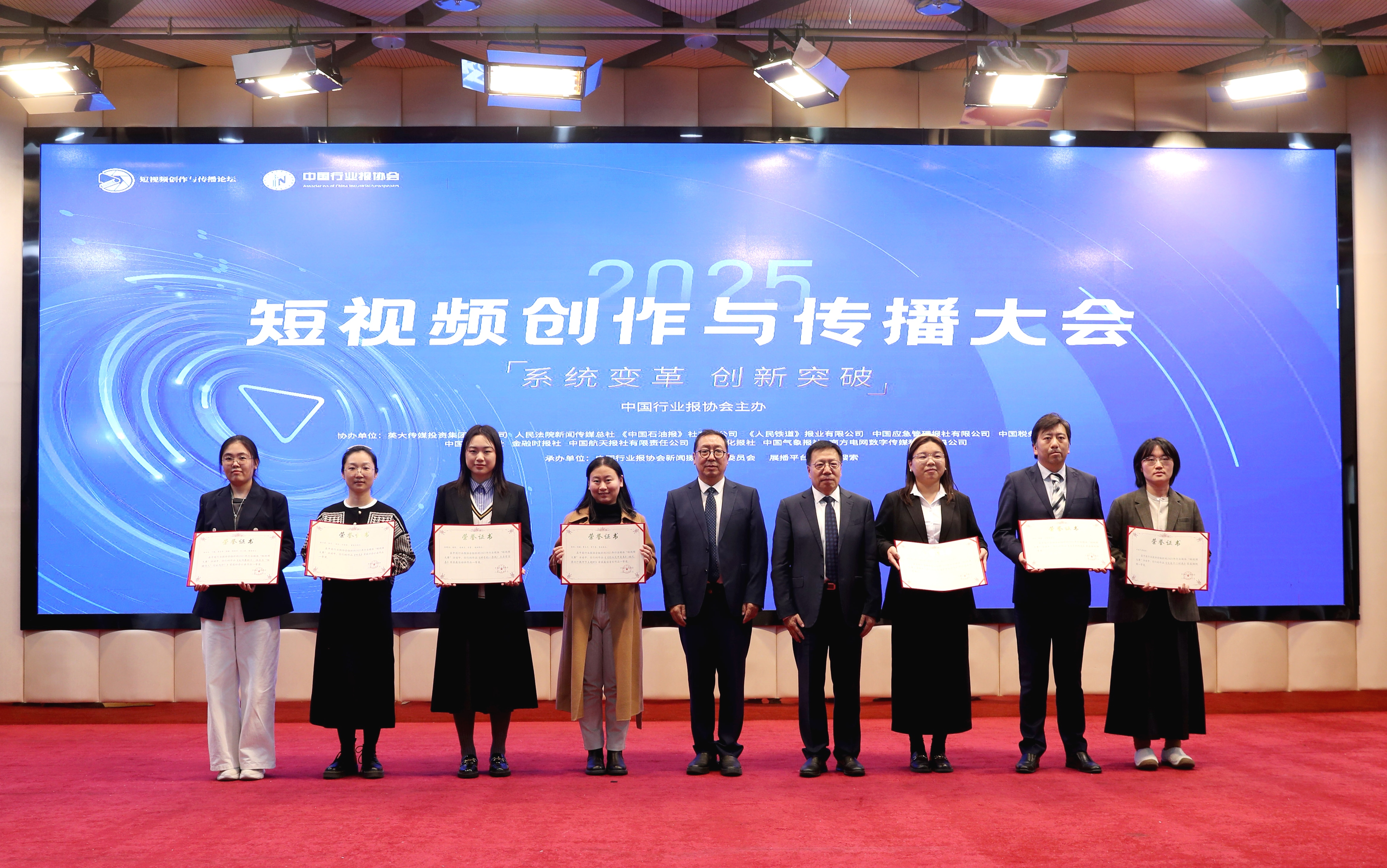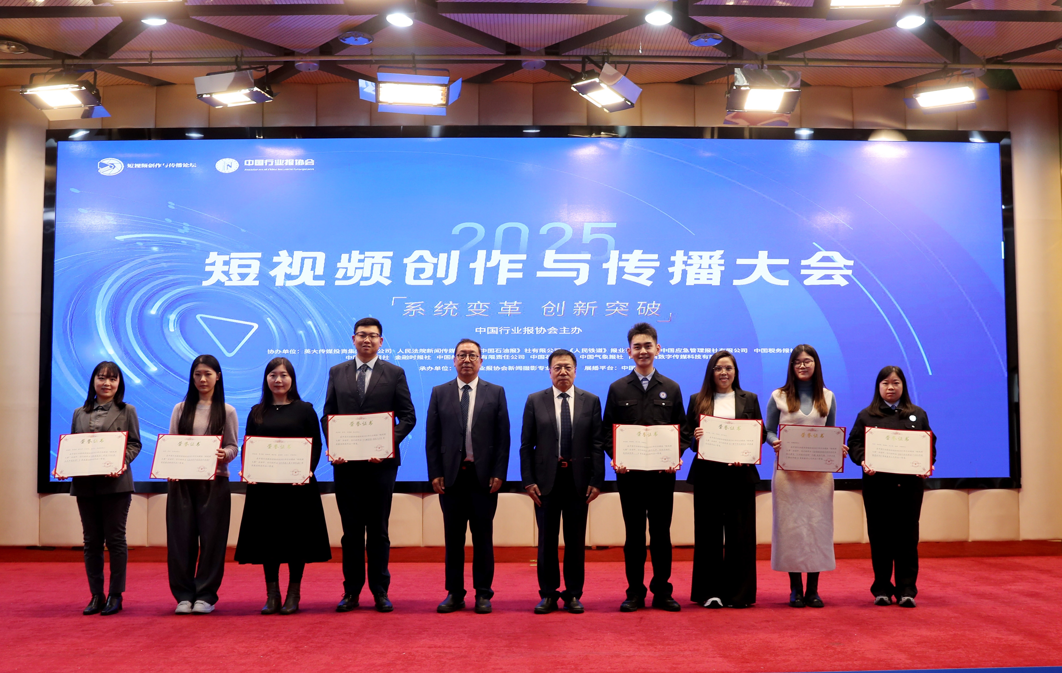 中国行业报协会会长张超文(右四),中国行业报协会驻会副会长孙福会(左五)向2025行业媒体短视频大赛一等奖获奖代表颁发证书。董芳忠/摄