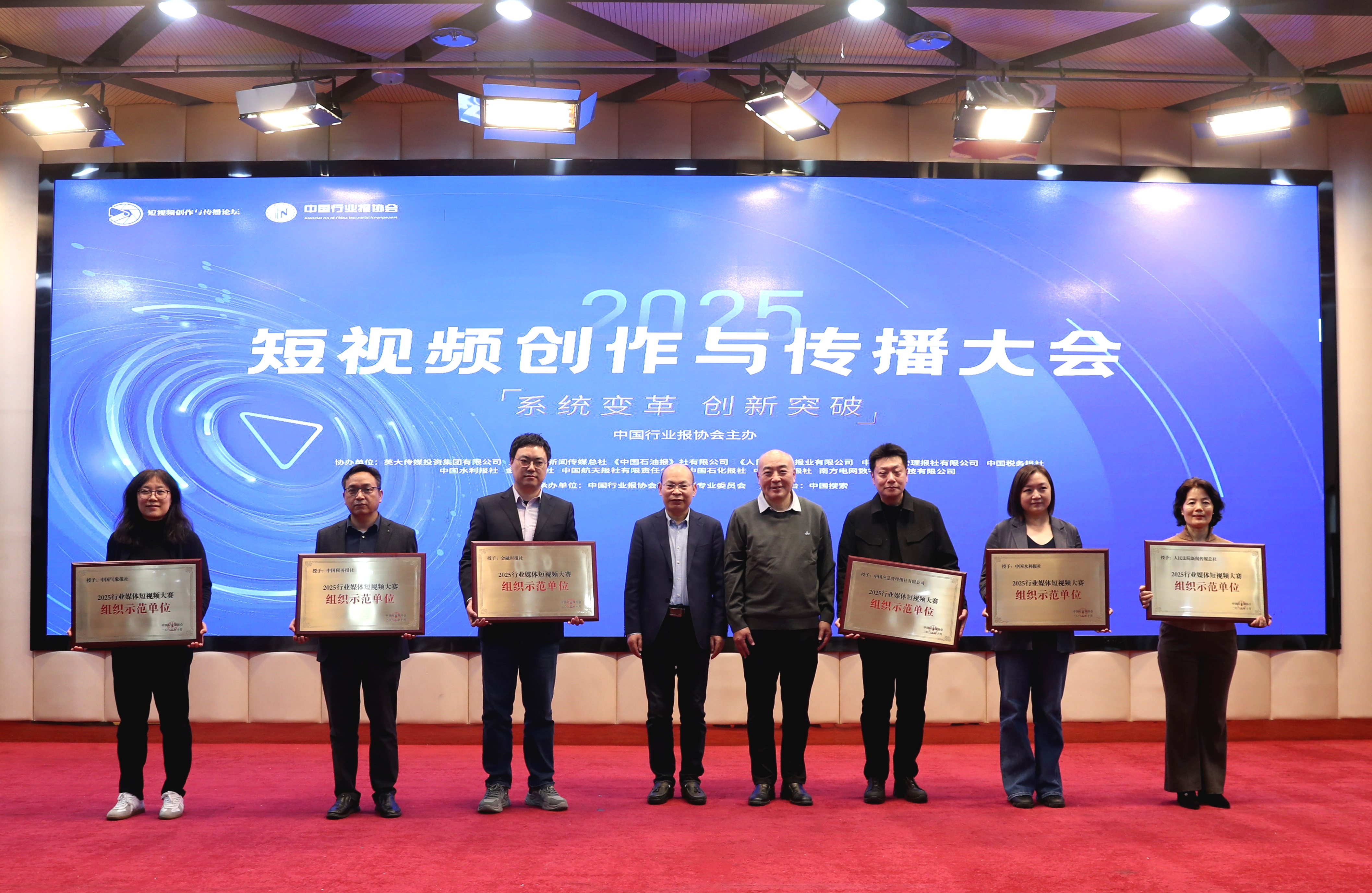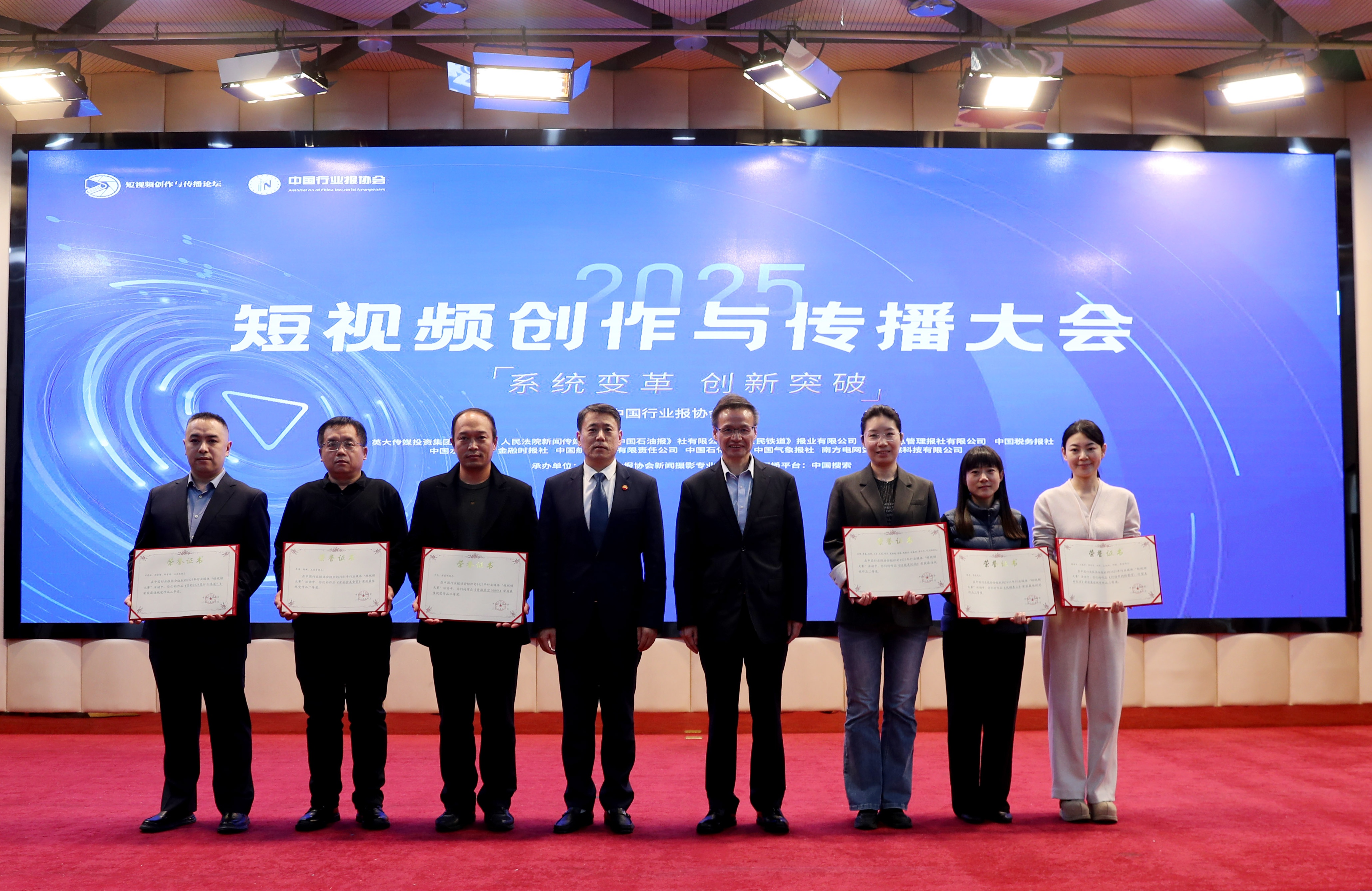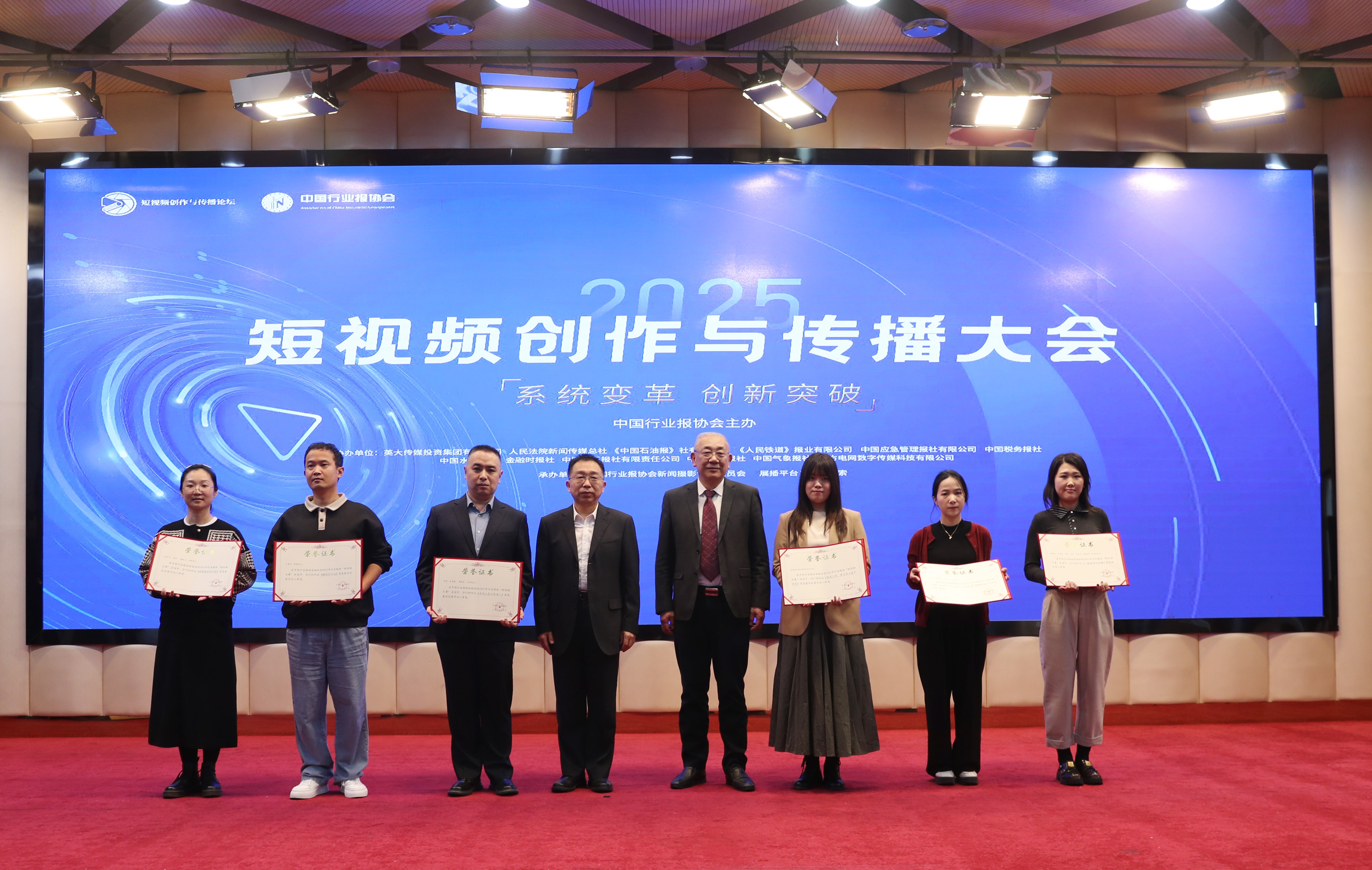 中国行业报协会会长张超文(右五),中国行业报协会驻会副会长孙福会(左五)向2025行业媒体短视频大赛一等奖获奖代表颁发证书。董芳忠/摄