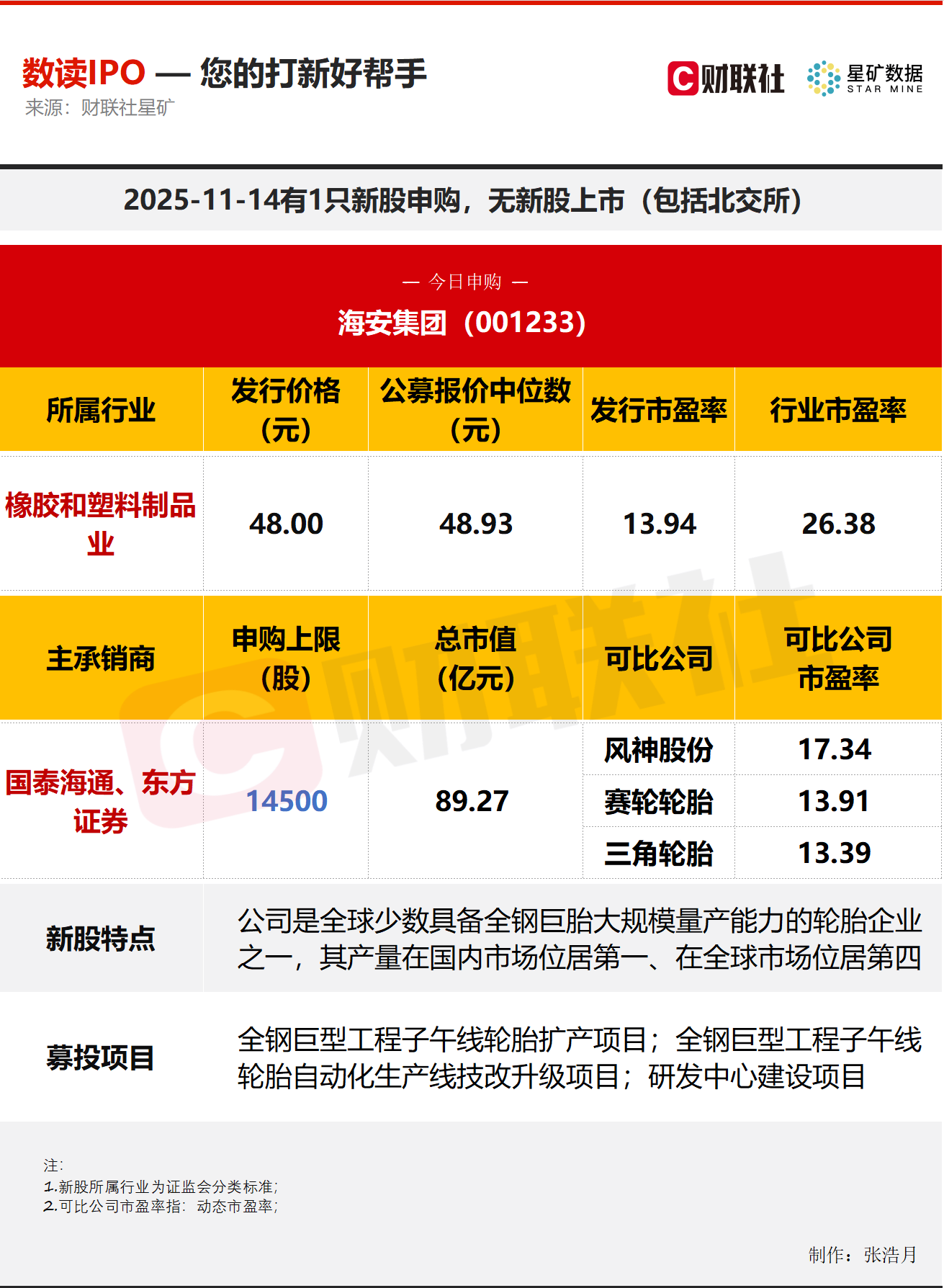 今日有1只新股申购,为深交所的海安集团;无新股上市。