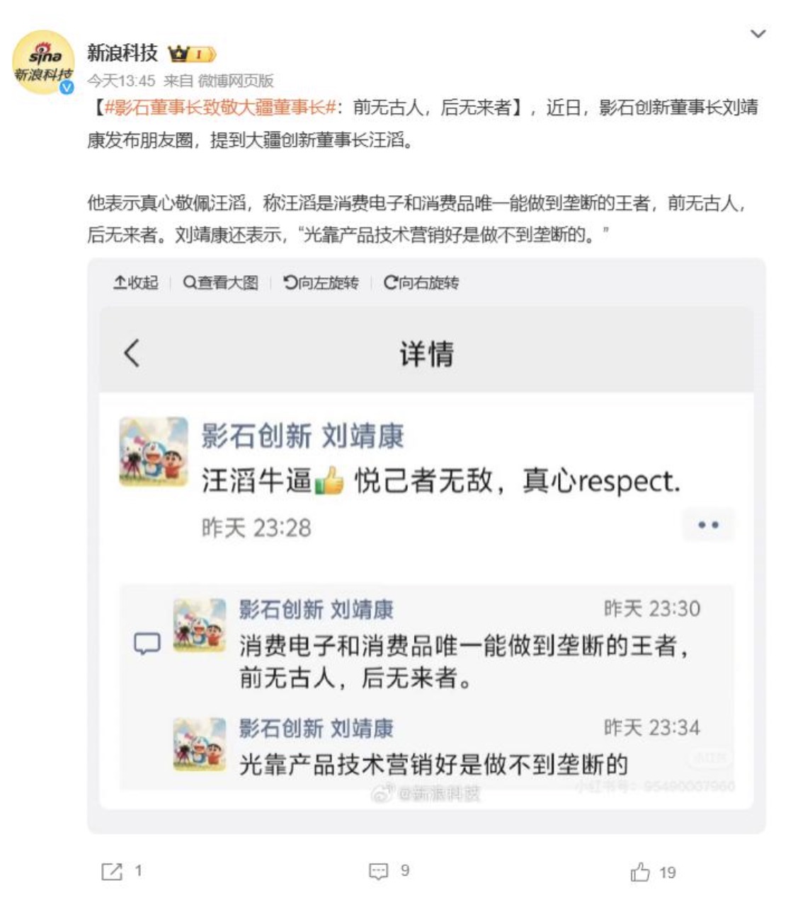 后来在评论区话锋一转,指出汪滔是“消费电子和消费品唯一能做到垄断的王者”,并称“光靠产品技术营销好是做不到垄断的”。