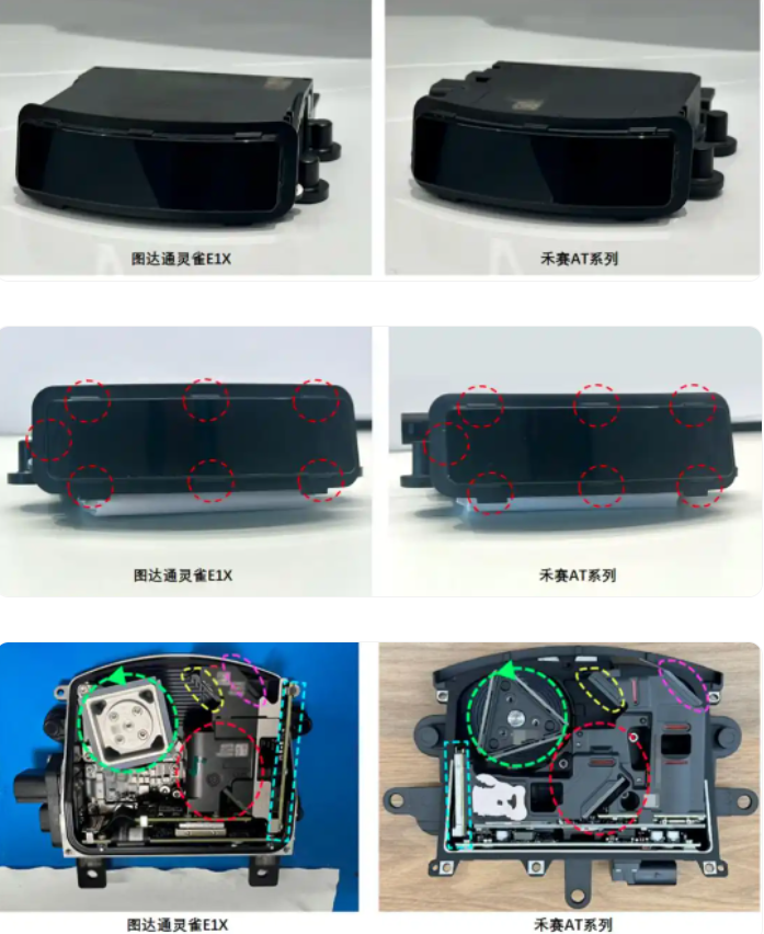 从《华夏时报》记者获取的拆机图可以清晰看到,灵雀E1X不仅外形和接口与禾赛ATX如出一辙,其内部扫描架构和光路设计也与AT系列基本一致。