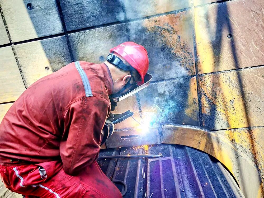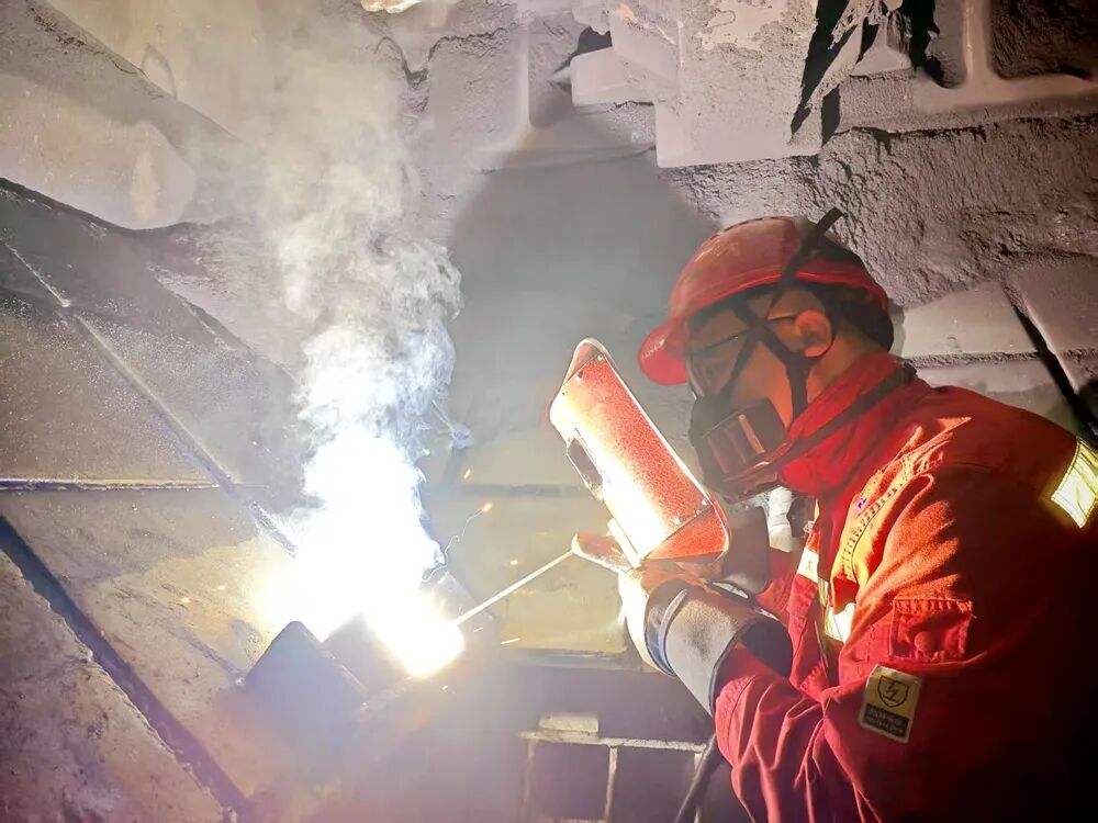 真正的考验从第三天上午开始。在旧板全部剔除后,下午便进入最关键的新板焊接环节。孟庆武和李俊文作为主焊工,承担了最核心重任。有限空间里,他们或蹲、或跪、或半仰,努力将焊枪精准地对准每一寸焊缝。