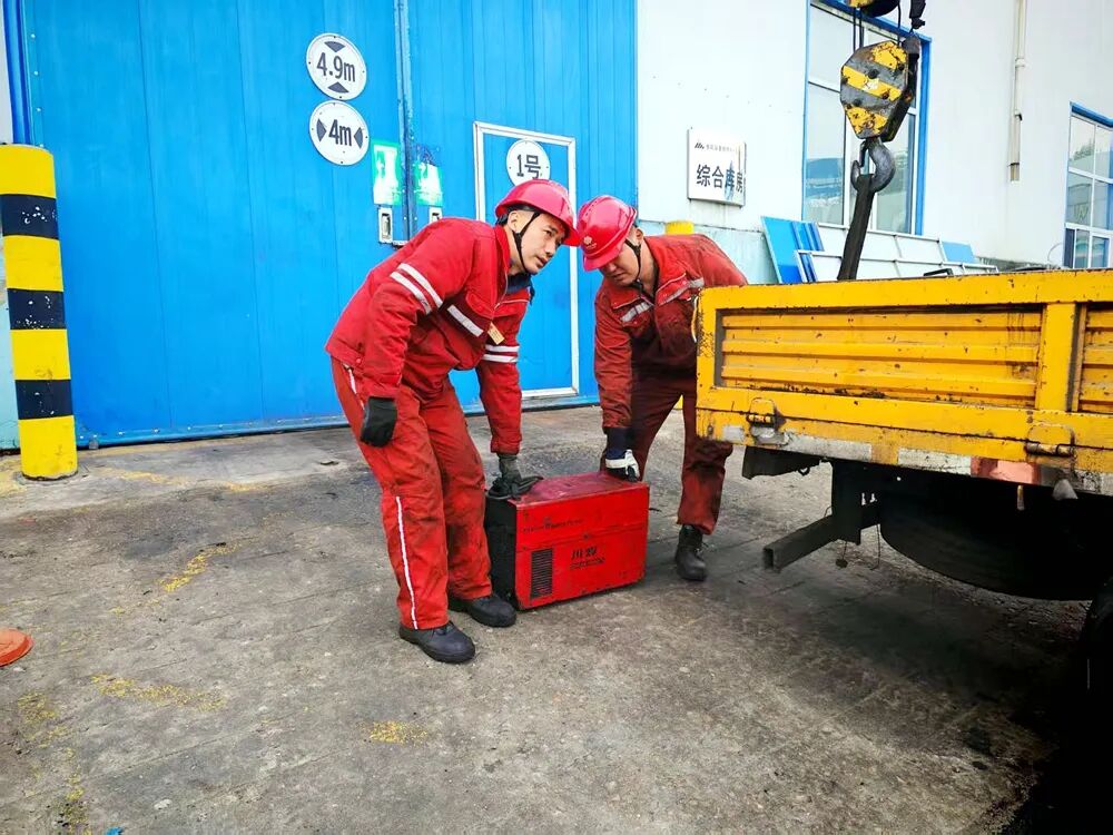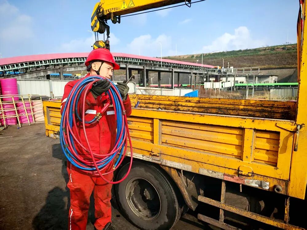战斗的号角吹响,班组瞬间忙碌起来。准备焊条、检查焊机、搬运氧气乙炔气瓶、清点新型融磁耐磨板……众人各司其职、动作麻利。不一会儿,焊接所需的全部“弹药”装车完毕,这支精干的小分队直奔501胶带机现场。
