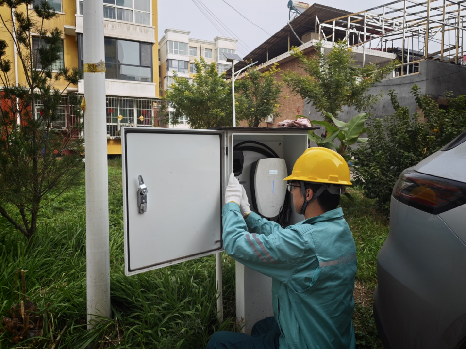 图为10月27日,国网临汾供电公司工作人员在大张镇检查用户充电桩。(李小璐 摄)